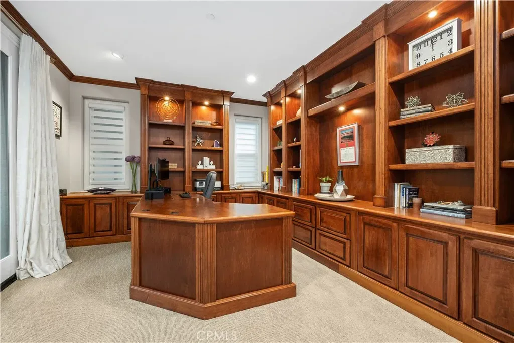 High ceilings and abundant natural light flood the open, flowing interiors, where an executive office impresses with custom built-ins perfect for productivity or quiet reflection. The heart of the home is the recently updated chef’s kitchen, featuring a striking quartz island, decorator backsplash, expansive walk-in pantry, and a butler’s pantry equipped with new ice maker and wine refrigerator—seamlessly adjoining a comfortable family room that gazes out to the resort-style backyard.