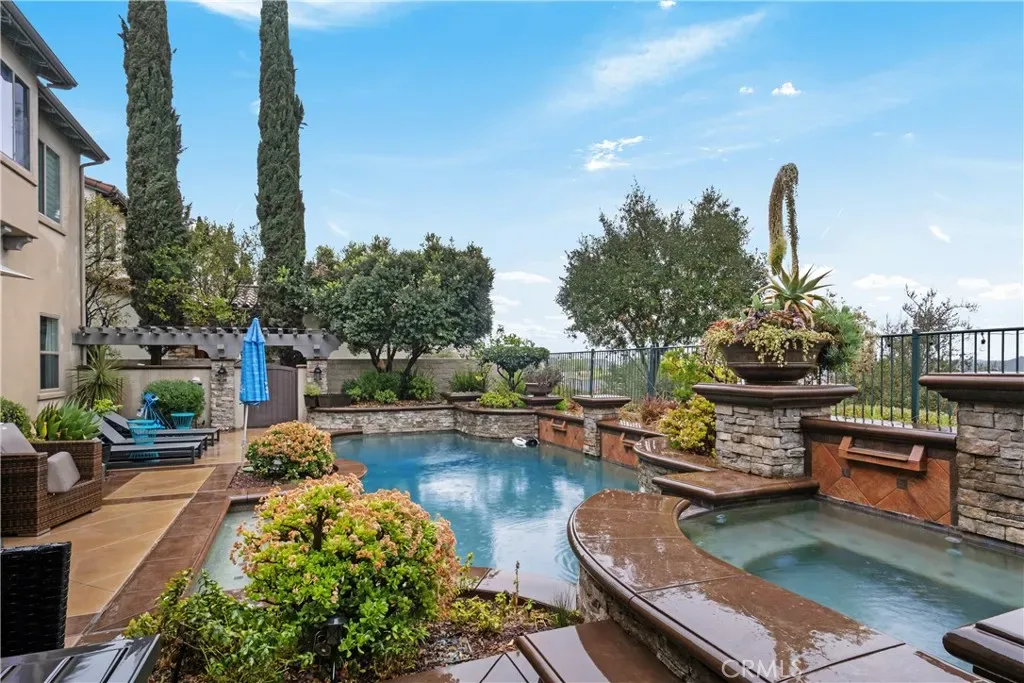 Step outside to your private paradise: a sparkling pool and spa with cascading waterfall features, an outdoor kitchen, a cozy living area, and a fireplace create the ultimate year-round retreat for entertaining or unwinding under the stars.