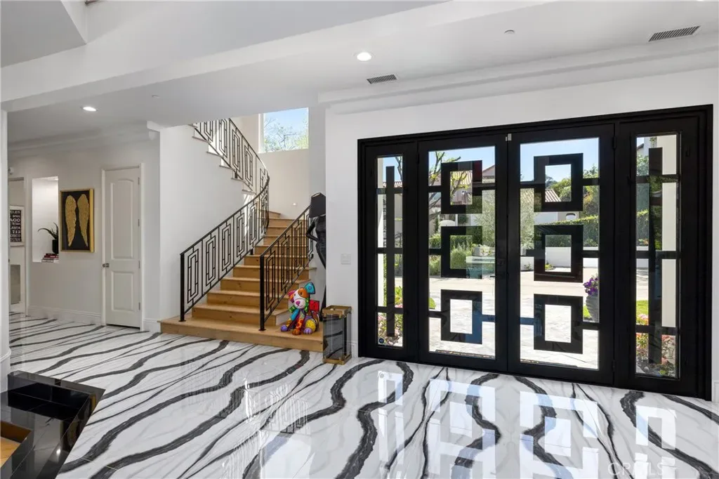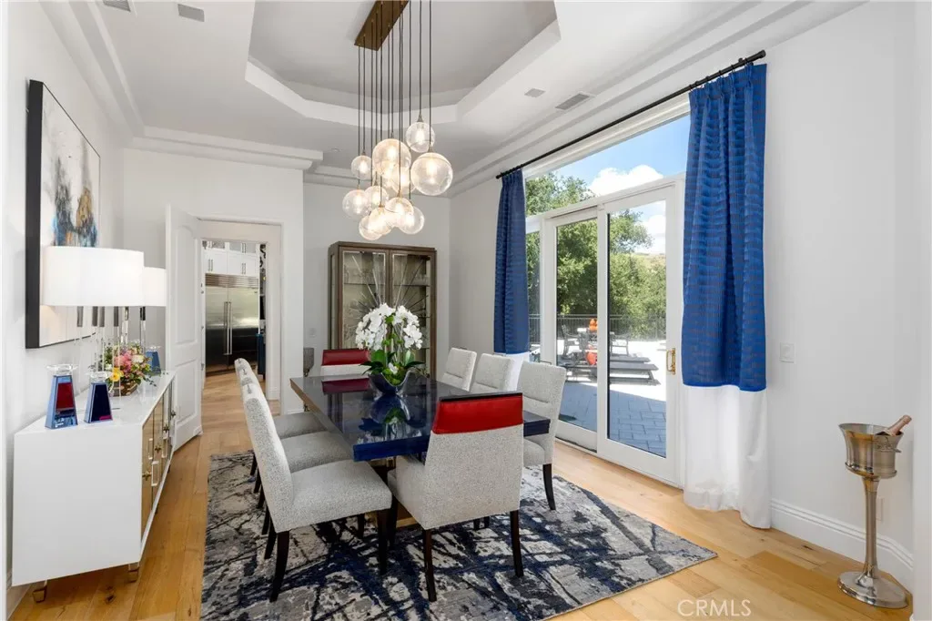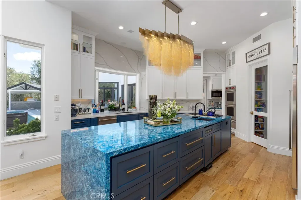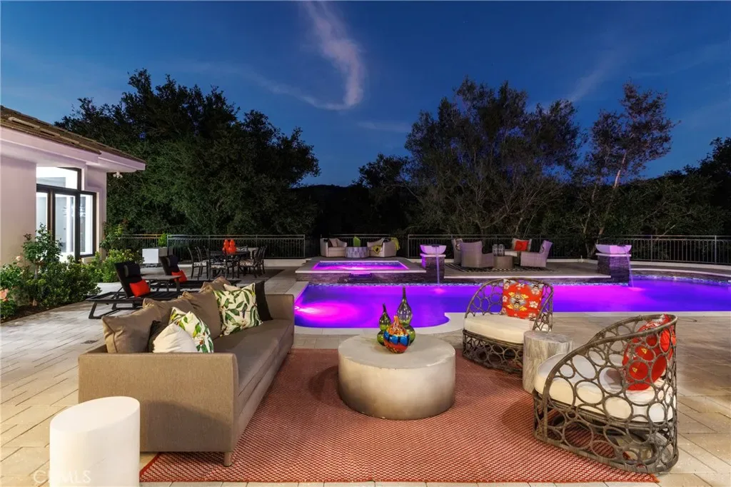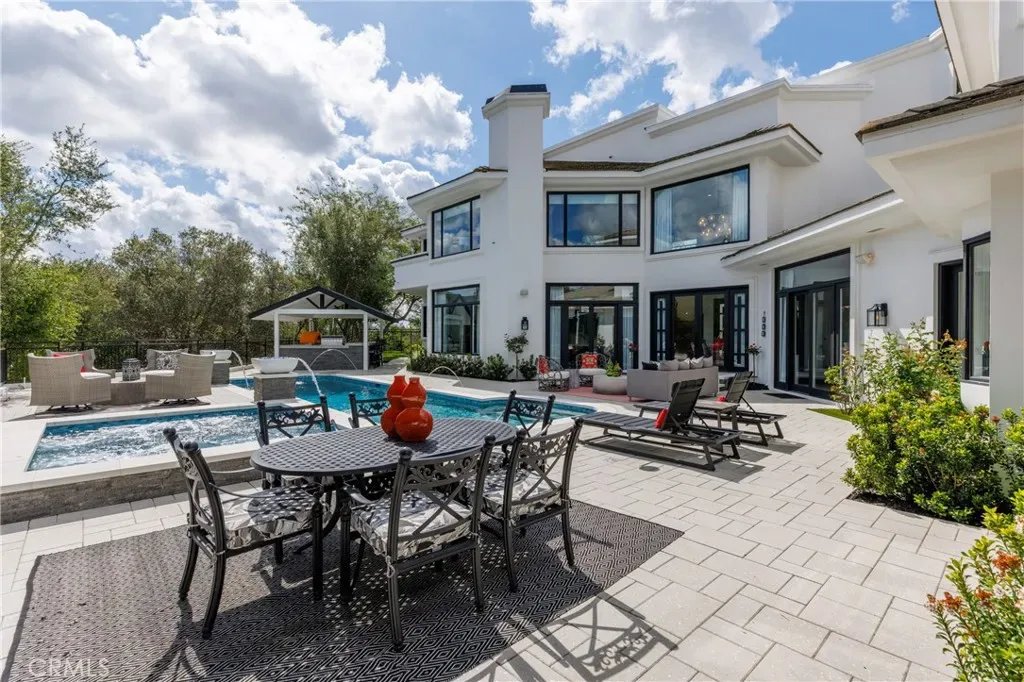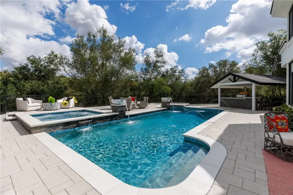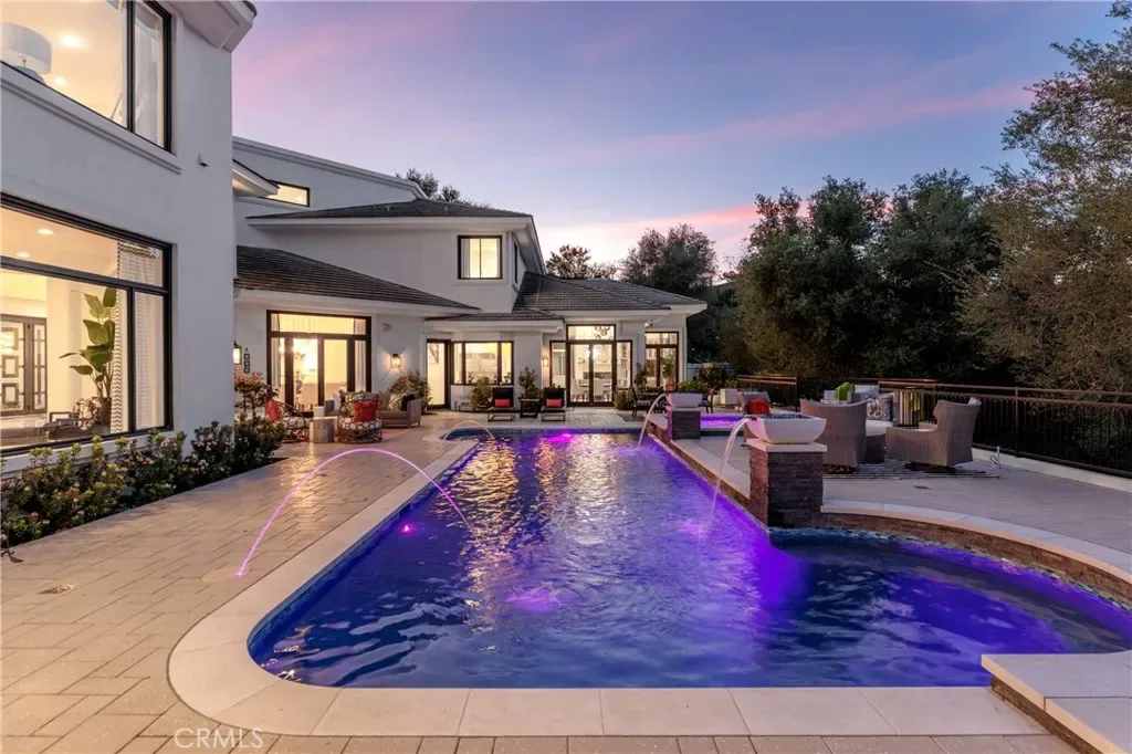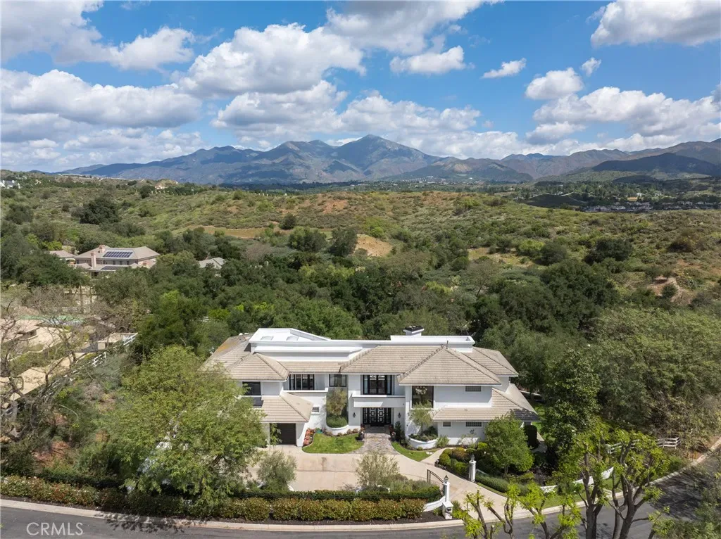 Welcome to 8 Palomino, a custom estate rich in architectural detail located in the prestigious guard gated community of Coto de Caza, within the highly sought-after Woods neighborhood. Set on nearly 1.2 acres, it offers approx 7,100 sqft of thoughtfully designed living space, with 7 beds/6.5 baths, & stunning views of the Saddleback Mountains. A private gated driveway sets the tone for this exceptional property. The main level showcases wide-plank white oak flooring & an expansive great room designed for both everyday living & entertaining. The kitchen is a chef’s dream boasting an oversized island with exquisite quartz countertops & stainless steel high end appliances (including a 46” Sub-Zero refrigerator & freezer and Wolf cooktop, double ovens, & warming drawer), walk-in pantry, prep sink with vegetable sprayer, coffee bar, and dual beverage drawers. The kitchen flows seamlessly into the breakfast nook and family room, highlighted by soaring ceilings, designer lighting, a fireplace, and an abundance of windows and doors that fill the space with natural light and open to the backyard. Additional main-level features include a formal dining room with coffered ceilings, a living room with fireplace and statement bar, a private office, oversized laundry room, a movie room / den, and two staircases for convenience. Two bedrooms with their own dedicated bathrooms are also conveniently located on the first floor. Designer touches and custom finishes are found throughout from the lighting to the powder room and bar area wrapped in Versace wallpaper. Upstairs, the primary suite offers a private retreat with its own balcony, fireplace, and sweeping views. The elegant spa-inspired primary bath features marble floors, oversized shower with marble surround, a freestanding soaking tub, and a stunning custom walk-in closet with center island. Completing the upstairs are 4 additional large bedrooms and 3 beautifully appointed bathrooms, along with a lounge area and two balconies. The resort-style backyard features a pool, spa, four fountains, two fire features, multiple seating areas, and a fully equipped outdoor kitchen and covered room complete with a pizza oven, smoker, BBQ, and ample counter space. The lower level of the property offers a large, flat pad—ready to be customized to suit your vision. The ideal blend of privacy, luxury, functionality, and design, 8 Palomino is a rare offering in one of Orange County’s most exclusive communities.