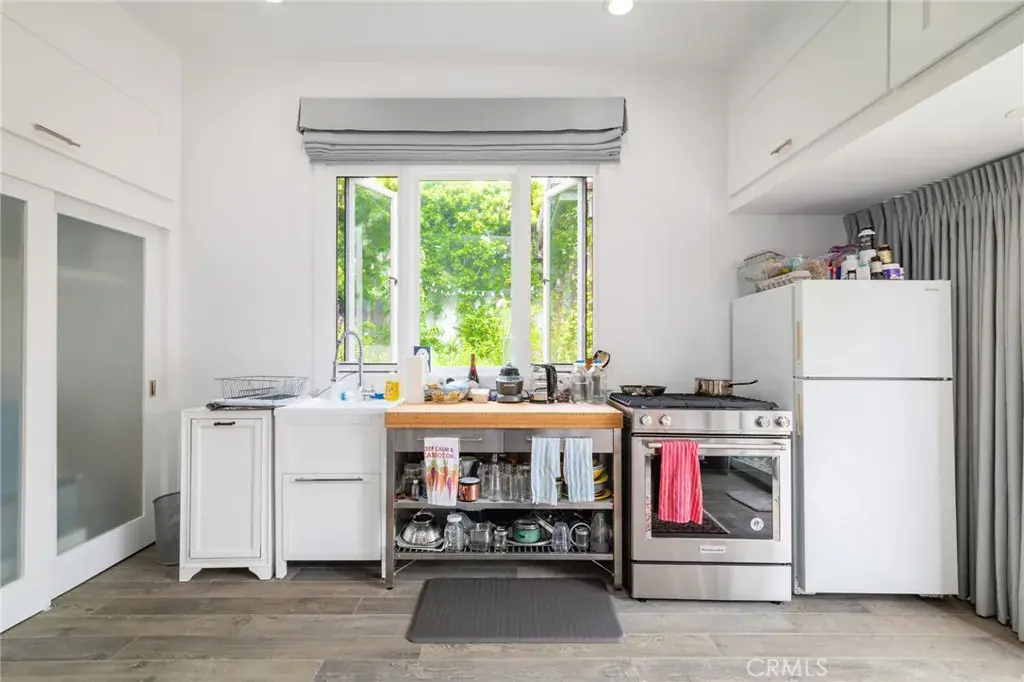 This property is a classic original 1920’s character Mediterranean home featuring six bedrooms and five bathrooms, in addition to a fully converted and separate cottage suite suitable for versatile use (mother-in-law apartment or art studio). The home features a modern, earthy, skim coat exterior, an oversize original front door, and a foyer tiled in Walker Zanger marble. The living area boasts a high, arched ceiling, Murano fixtures, an original Batchelder gas fireplace, built-in shelving, and original 3/4 inch hardwood floors. The kitchen includes a central island with a full stove/oven, a separate wall-mounted dual oven, a breakfast nook with built-in storage, ample counter space, and abundant natural light, with all appliances included. The former front porch has been incorporated to create a library/den space with matching oak hardwood floors, custom shelving, and custom front-facing windows. The spacious dining area is highlighted by a custom 128 raindrop blown glass fixture, a large north-facing window, and three skylights. A dedicated family room completes the interior features, including a TV, a bar sink, and handmade wood cabinets.