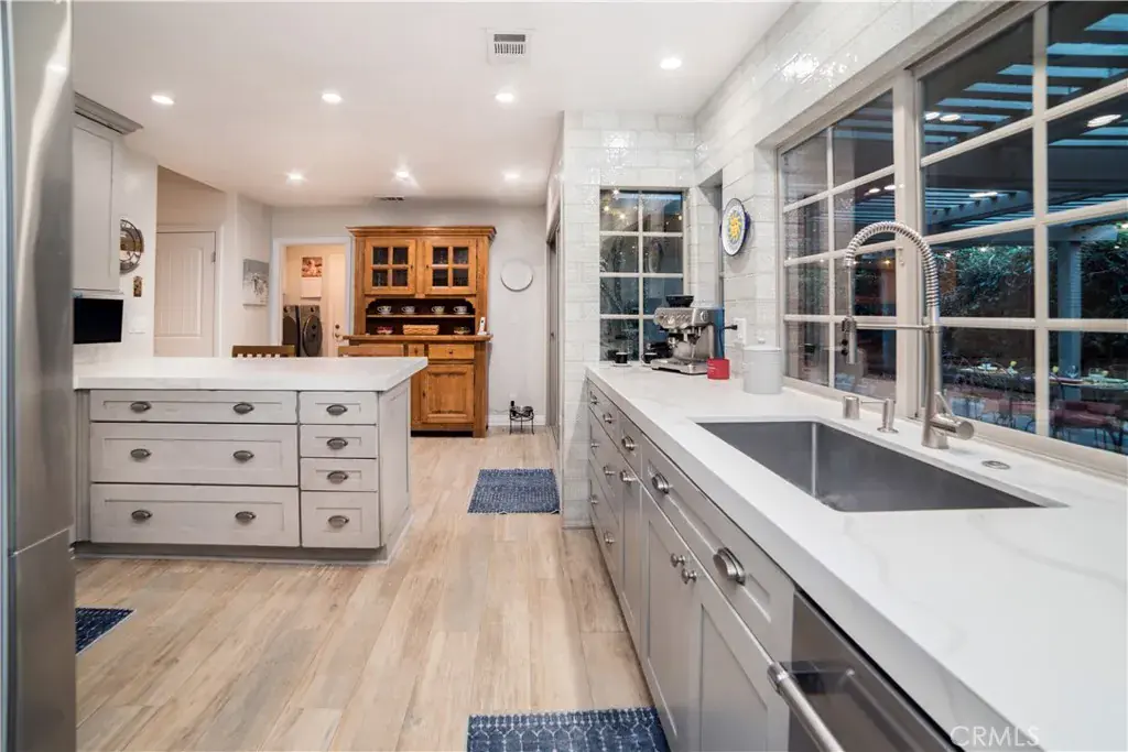 The spacious dining area is filled with natural light and framed by a full wall of custom plantation shutters, creating a bright yet private setting perfect for everyday meals or entertaining. The adjacent kitchen has been tastefully remodeled with quartz countertops, full tile backsplash, custom cabinetry, and stainless steel appliances, including a professional-style gas range and French-door refrigerator. Large windows over the sink provide a peaceful view of the outdoor space and bring in abundant natural light.