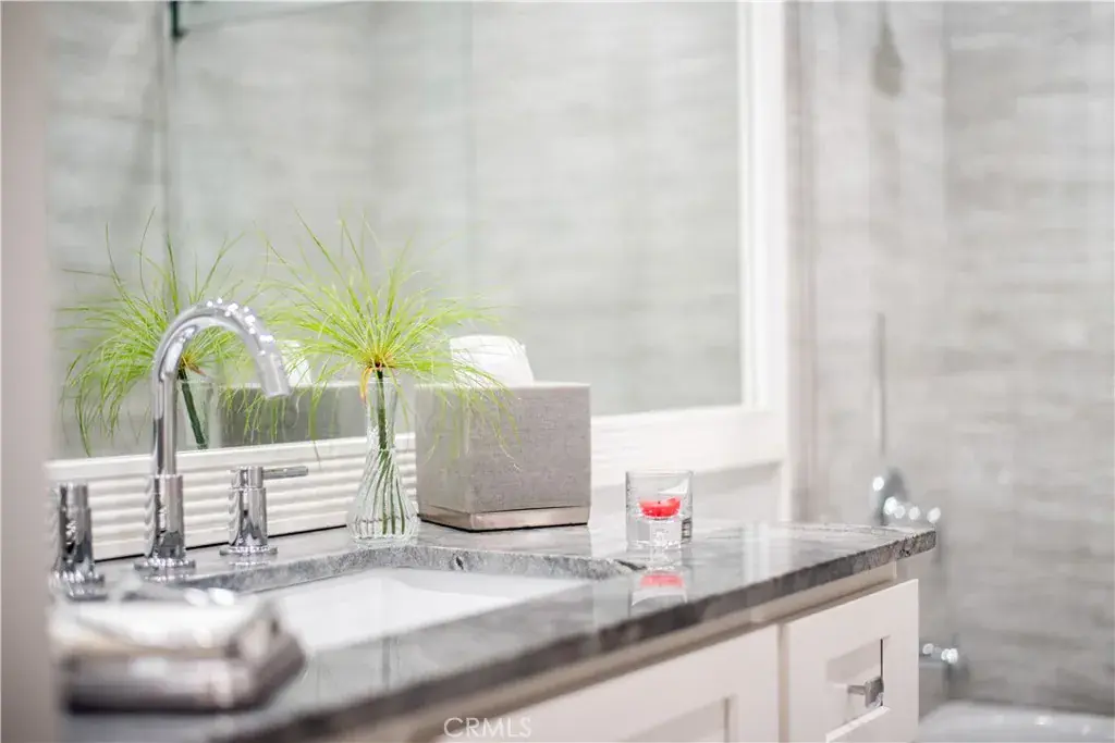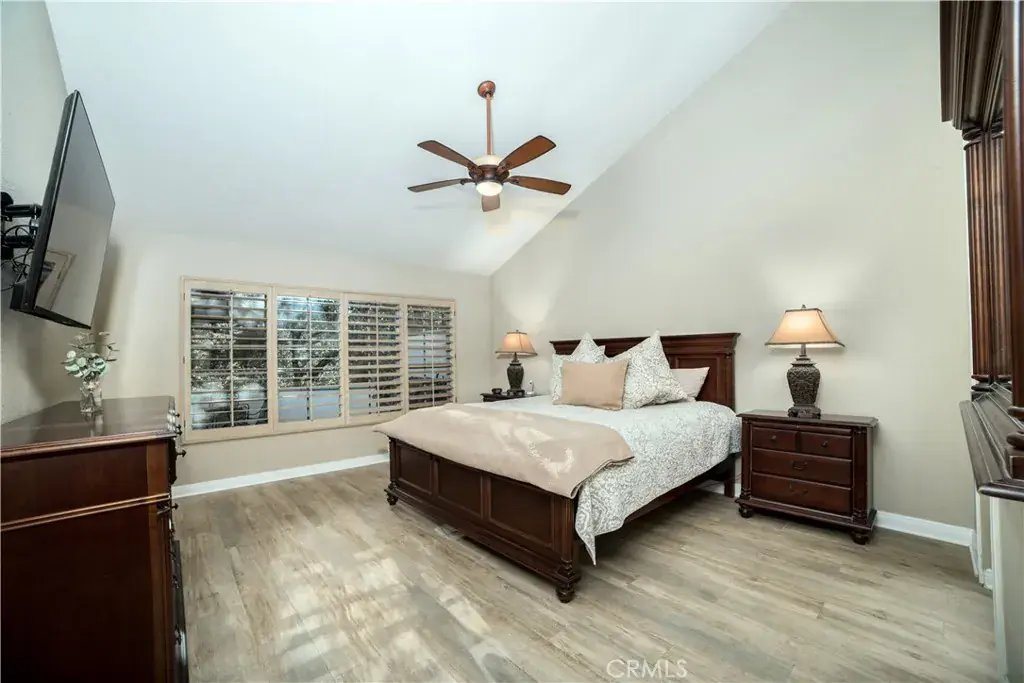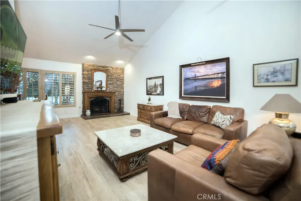 This beautifully updated residence located in Covina Hills offers an ideal blend of warmth, comfort, and indoor-outdoor living. The inviting living room features soaring vaulted ceilings, recessed lighting, a modern ceiling fan, and a striking stone-faced fireplace that serves as a stunning focal point. Wide-plank porcelain tile flooring flows throughout, creating a seamless and open feel.