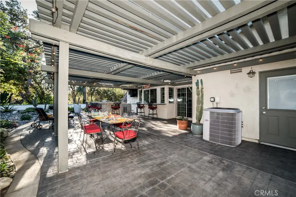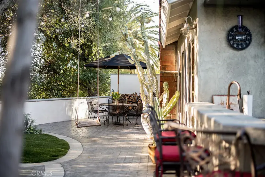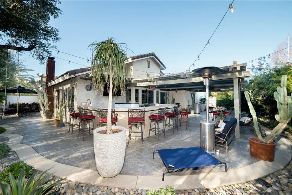 Step outside to a resort-style backyard designed for entertaining and relaxing year-round. A large covered patio with wood pergola, string lighting, and expansive paver decking creates multiple outdoor living and dining areas. The custom outdoor bar with built-in seating and wall-mounted TV makes this space ideal for gatherings, game days, and summer evenings. Lush landscaping, mature trees, and curated garden areas provide privacy and a tranquil setting, while additional seating areas and a charming swing add to the inviting atmosphere.