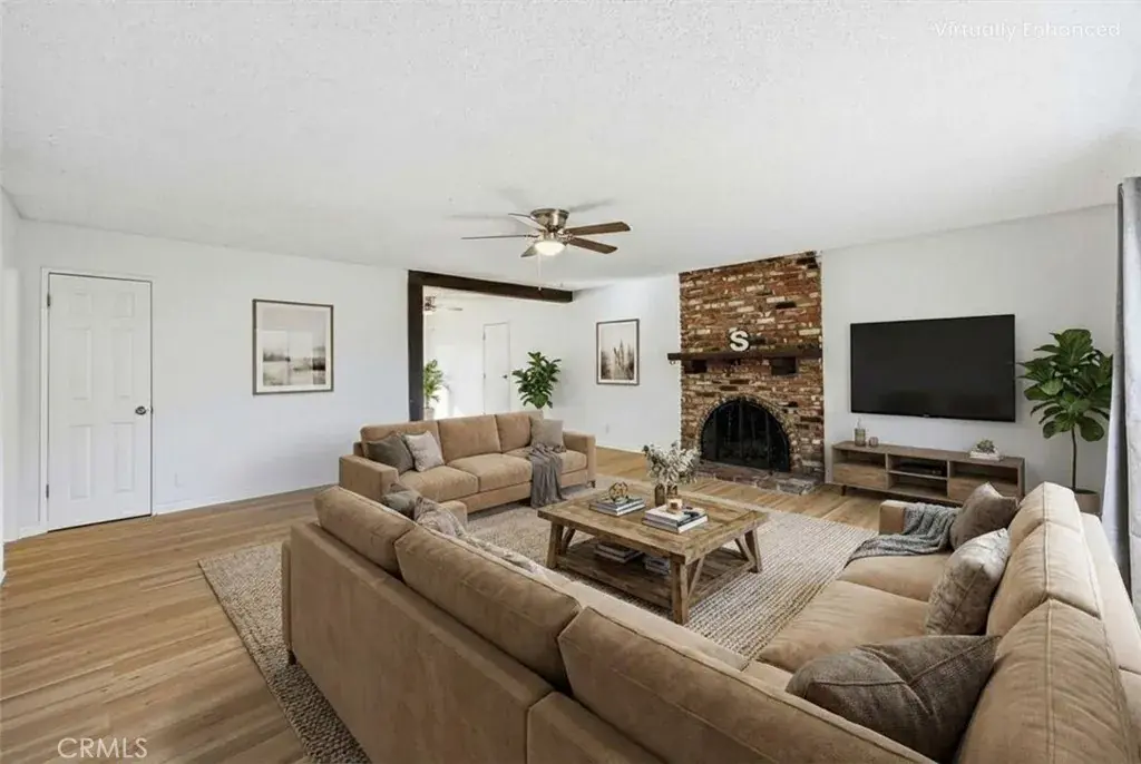 The generous living room is warm and inviting, highlighted by a cozy brick fireplace with a custom mantle—perfect for relaxing or entertaining. The spacious, updated kitchen offers ample cabinetry and updated appliances, providing both functionality and style.