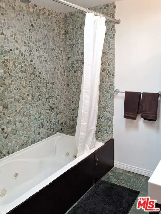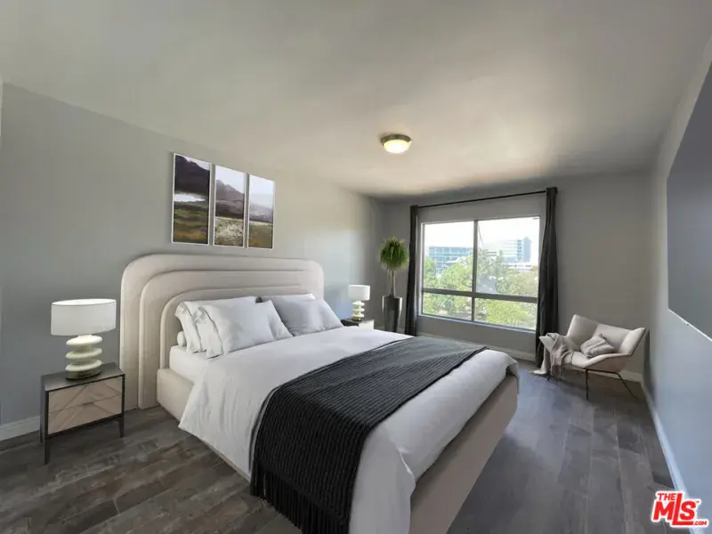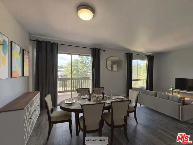 **REDUCED!** Motivated Seller! ** Whether you’re relocating to the Culver City area, or looking for a stylish pied-a-terre, this gorgeous top-floor unit in the Adobe Grande complex is the perfect fit! Double-Entry Doors welcome you into a spacious unit, with an open floor plan that connects the living spaces and balcony for a clean light-filled area perfect for both entertaining and everyday living. The galley kitchen has been beautifully remodeled, and features stone countertops and stainless steel appliances. Look out over treetops and city lights, with no neighbors in front to block your view or impose on your privacy. Sliding glass doors lead from the dining area onto a cozy balcony that’s suited for enjoying a morning cup of coffee, or catching a spectacular sunset. There is a 2-piece guest bathroom, plus a full-size bathroom down the hall, with a rain showerhead, and a jetted tub to soak away the stresses of the day. The bedroom suite includes a large walk-in closet, and picture windows. Overall, this unit offers an exceptional layout with abundant storage and closet space. The HOA features secure entry, gated parking, elevator, lush landscaping, pool, hot tub, and clubhouse. There is communal laundry room on each floor, with brand-new machines, but there may be an option for in-unit laundry, with permits and HOA approval. Additional conveniences include extra storage space, secured bike room, and one parking space. Adobe Grande is a secure, resort-like complex with a sparkling pool and spa, recreation room, and beautiful grounds featuring running brooks and a koi pond, all just steps from your front door. Situated close to Fox Hills Park and Westfield Culver City Mall, with easy access to freeways and short drives to Venice Beach, Marina del Rey, LAX, and premier restaurants, this location blends convenience with lifestyle. [All furnishings and decor are virtually rendered.]