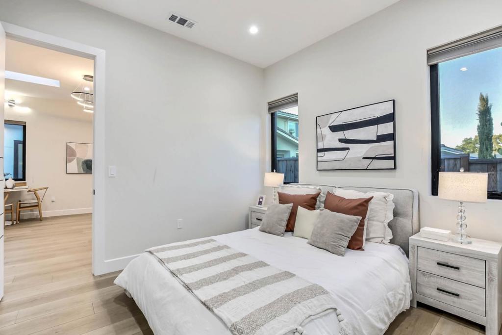 Brand new modern home with open floor plan, high & modern ceilings with adjustable day & night modes, & wide-plank oak floors. Double entry & great room with floor-to-ceiling feature wall, linear fireplace,& oversized windows. The kitchen has full-wall custom cabinetry, waterfall island, pot filler, & stainless appliances: Refrigerator with French Doors, Electric Cooktop with Modern Hood, wine cooler & dishwasher. Butlers pantry includes a full-size fridge, electric range, microwave, utility sink, & mini-split HVAC. Main-level ensuite features custom fluted paneling, glass French doors, & spa-style bath with rainfall shower. Upstairs loft with skylight & balcony leads to the luxurious primary suite with wall-to-wall windows, freestanding tub, dual LED-lit vanities, & frameless shower. ADU offers full kitchen, skylight, hardwood floors, laundry, stylish bath, & bedrooms. Separately metered PG&E service for the main home & ADU, each with owned solar, Tesla Gateway, & Powerwall 3 backup;total installed solar capacity of 13.76 kW. Smart-home features include a SPAN panel, whole-home speakers,TV, and media sources, smart water heaters, leak detection with auto shutoff, & adjustable modern lighting. Expansive yards & 2-car garage. Located across Apple Campus, CU Main Street, & CU High.