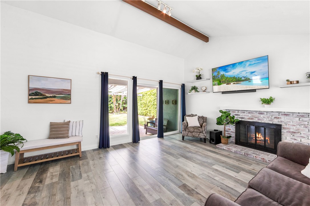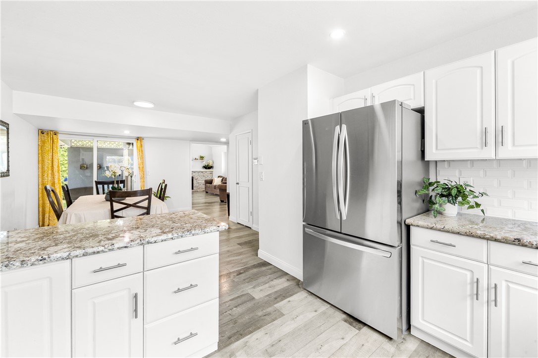 Designed for both everyday living and effortless entertaining, the inviting living room is anchored by a charming brick fireplace, and features vaulted ceilings, this space offers the perfect setting for cozy evenings at home. The remodeled kitchen has been remodeled with both style and functionality in mind, with white cabiinets and grantie countertops that provide a clean, open space to gather, cook, and connect.