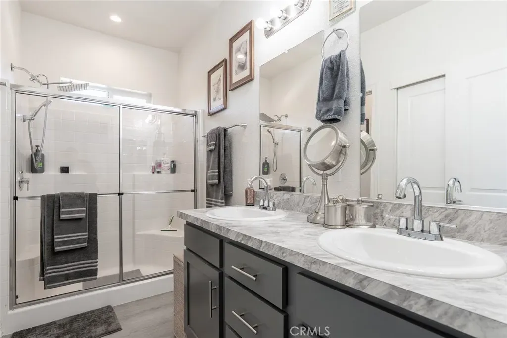 The spacious primary suite offers a comfortable retreat with an en-suite bathroom featuring dual sinks, generous counter space, and a large walk-in shower. A second bedroom and full bathroom provide flexibility for guests, a home office, or hobbies.