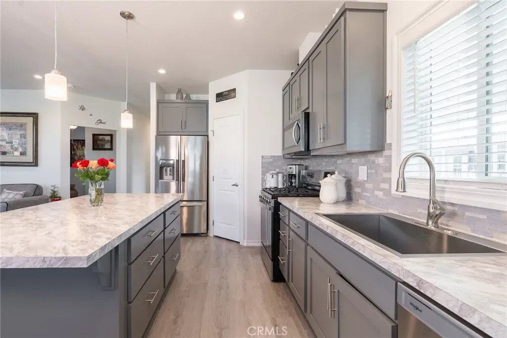 The modern kitchen is a standout feature, complete with stylish gray cabinetry, stainless steel appliances, a large center island with seating, contemporary countertops, and elegant pendant lighting. The open layout allows the kitchen to connect effortlessly with the main living space, making it the heart of the home.
