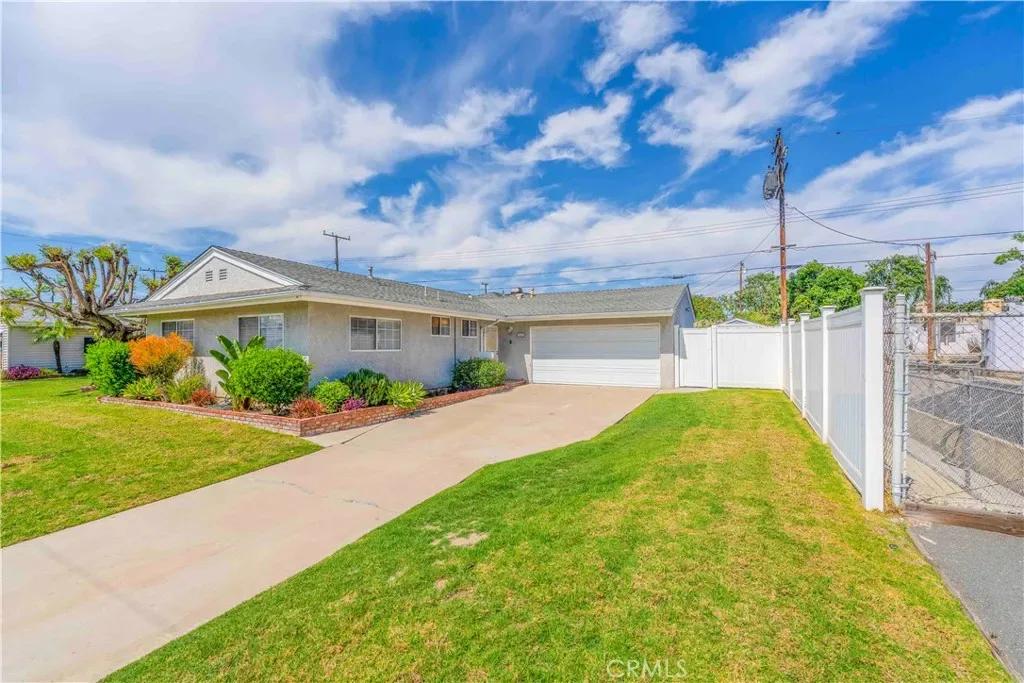 Nestled in one of the most sought-after and quiet interior tracts of Cypress, California, this stunning single-story Brentwood at 5101 Myra Avenue is more than just a house—it is the quintessential Southern California home. Combining mid-century charm with thoughtful modern updates, this property offers an unparalleled lifestyle for those seeking comfort, community, and convenience. From the moment you pull up to the oversized driveway, the pride of ownership is evident. The home features a well-maintained front lawn framed by classic brick borders and updated stucco, offering a clean and inviting aesthetic. With a spacious two-car attached garage and ample street parking, there is plenty of room for guests and family alike. Step through the formal entry into a light-filled floor plan spanning approximately 1,410 square feet. The heart of the home is the expansive living and family room area, which boasts soaring vaulted ceilings and a cozy brick fireplace—perfect for cool California evenings or festive holiday gatherings. Situated on a generous 6,000 square foot lot, the backyard is a true extension of the living space. Step through the sliding glass doors to find a private retreat featuring an open patio with integrated drains—ideal for summer BBQs, outdoor dining, or simply enjoying the Cypress sunshine. Whether you envision a lush garden or a play area, this backyard offers the space and privacy to make it your own. WELCOME HOME…