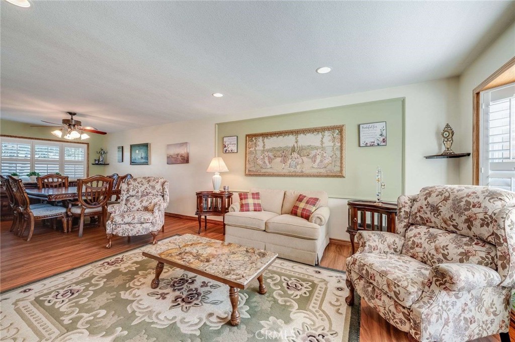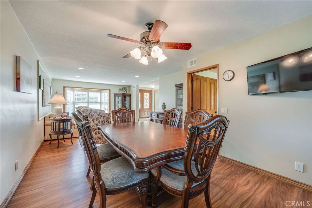 Rare opportunity to own a truly one of a kind home situated on an oversized premium pie shaped lot of over 8,000 square feet. Excellent curb appeal welcomes you with a wide driveway and a low maintenance front yard. Double door entry opens to a beautiful terrazzo foyer that leads into a bright and sunny living room featuring a bay window and plantation shutters found throughout the home. A spacious formal dining area and easy care luxury LVP flooring create an inviting space ideal for both daily living and entertaining.