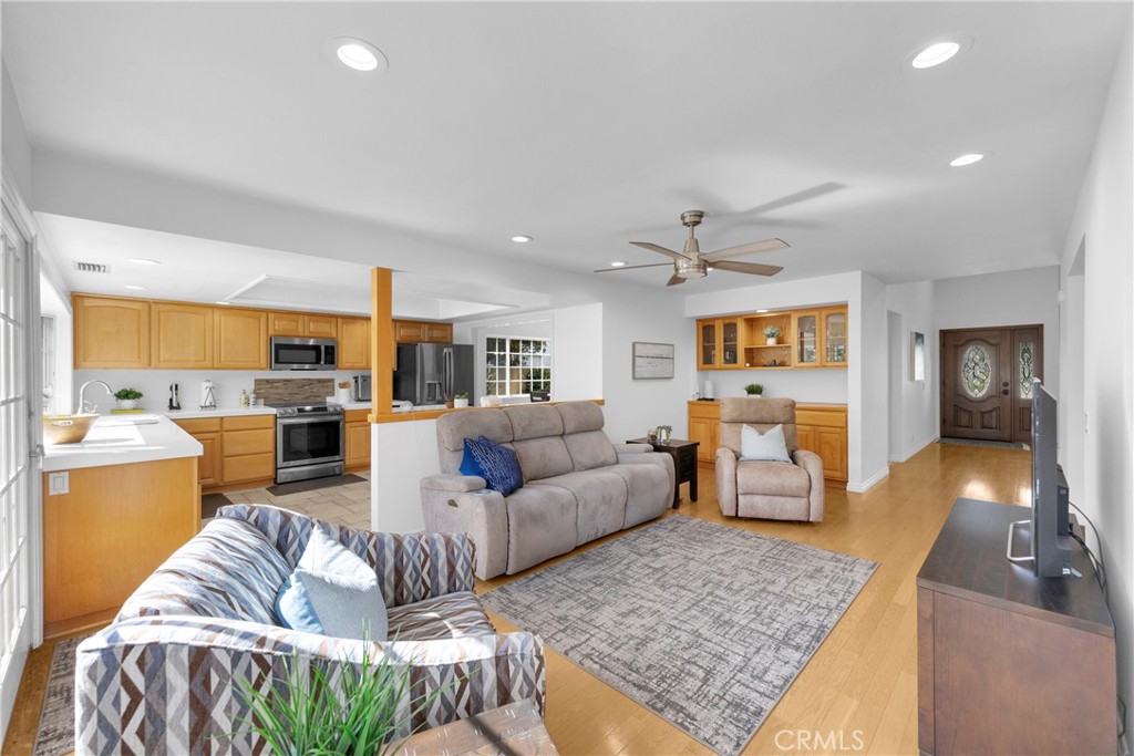 Welcome to 9326 Cambridge Street, a “Turnkey” Highly Upgraded Executive Home in the heart of Cypress with a rare Community Pool and Park. This beautifully appointed home offers standout curb appeal with its 3 story high, dimensional roof, attractive hardscape and artificial turf. This spacious and popular floorplan opens with soaring vaulted ceilings, an impressive balcony, and a spacious living room with a distinctive floor to ceiling fireplace and wall to wall raised hearth. The light “real” hardwood flooring flows through the family room to the backyard and expansive kitchen where large windows and sliding doors create the open, connected feel buyers love. The kitchen features light “real” hardwood cabinets and pantry, quartz countertops, stainless steel appliances, and a large breakfast bar perfect for everyday living and entertaining. The remodeled formal dining room is now open to the kitchen and has a backyard view. A highly sought after first floor primary suite with remodeled and expanded primary bath adds flexibility, comfort, and convenience. Two additional first floor bedrooms and the fourth bedroom upstairs with a large bonus room that can easily convert to two additional bedrooms if needed. Upstairs, the oversized bonus room is set up as an impressive home theater with surround sound, creating the ultimate space for movies, sports, gaming, or a private media retreat. The private backyard is beautifully finished with a large paver patio, green lawn, and raised planters with auto drip watering, making it ideal for relaxing or entertaining. Huge indoor and outdoor storage areas. Additional standout features include solar on valuable NEM 2, a Tesla Powerwall 3, and an EV charger in the garage (The savings could pay for as much as $80,000 of your new loan). This is a rare move in ready opportunity to own one of Cypress’s most sought after floor plans close to parks, shopping, dining, and everyday conveniences. Walking distance to highly rated Landell elementary, Arnold elementary, Lexington Junior High, and Oxford Academy (junior and senior high school). Easy access to numerous freeways. Virtual tour link: https://my.matterport.com/show/?m=2ub1eKxgAU7 Aerial Video Link: https://youtu.be/WrvtqaRnezM
