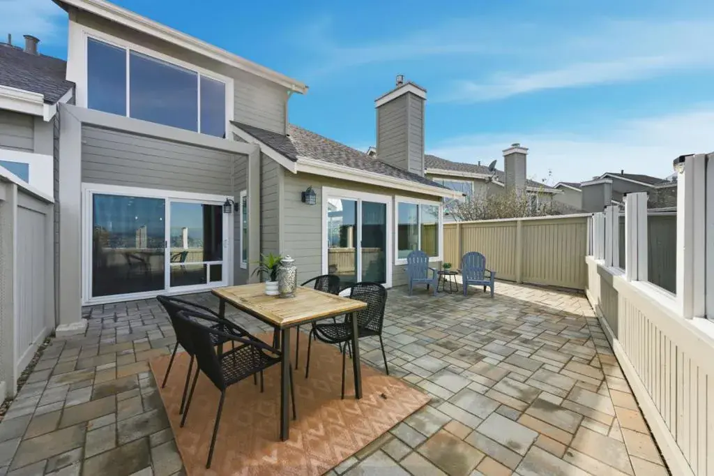 FHA Approved Community. Welcome home to this move-in ready, fully renovated semi-detached townhome with amazing, unobstructed panoramic views of the San Francisco Bay Area, located in the family and pet-friendly, parklike Village in the Park community. Hallmark French Oak engineered hardwood floors run through the main level and bedrooms. The spacious eat-in kitchen features custom wood cabinetry, modern countertops, and stainless steel appliances including Bosch double ovens, cooktop, microwave, dishwasher, and a Whirlpool refrigerator. Newer dual-pane windows and sliding doors enhance light and efficiency. Each bathroom is beautifully remodeled with custom tile, new vanities, and water-efficient fixtures. Upstairs offers two bedrooms, including a primary suite where you wake up to stunning Bay views, plus a den that can easily be converted to a third bedroom. The low-maintenance backyard is fully paved with custom pavers, ideal for relaxing or entertaining. A new electrical sub-panel and EV outlet were installed in 2022. 2-car garage, driveway parking, plus 2 permitted spaces. Community amenities include a pool, hot tub, and lush greenbelts. Close to San Bruno Mountain trails, Westlake shopping, BART, and major freeways for easy travel. A rare opportunity you wont want to miss!