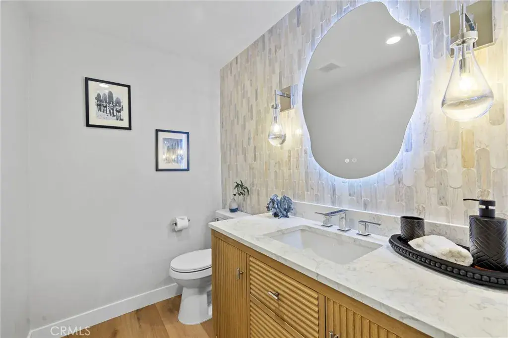 The guest powder room features a marble tile accent wall, stunning custom vanity completed by hanging light fixtures and a touch light mirror that leaves a lasting impression. Additional highlights include a new custom staircase, pex plumbing throughout and a two-car garage. From top to bottom, this townhome reflects superior craftsmanship and luxury upgrades at every turn. This exceptional property delivers the ultimate in coastal elegance and modern living. This is a rare opportunity to own a turnkey ocean-view townhome.
