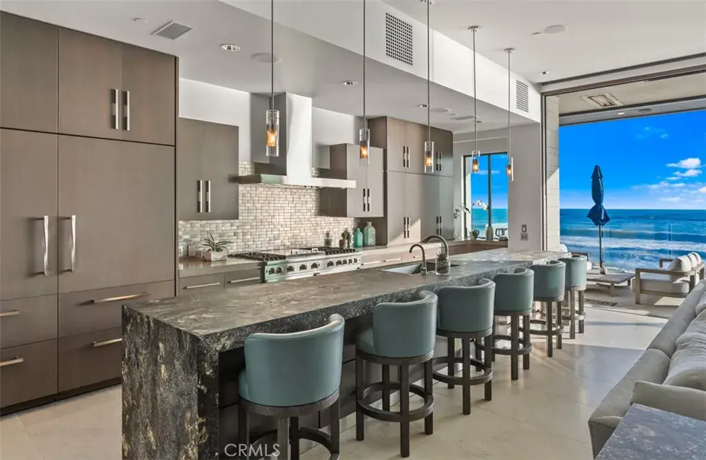 The open-concept floor plan features a spacious great room with soaring ceilings, a sleek island kitchen with top-tier appliances, dual refrigerators, a wine fridge, and a stone fireplace. A wall of glass sliders opens to an expansive oceanfront deck, creating seamless indoor-outdoor flow. Additional highlights on the main level include an elevator, powder bath, and modern finishes throughout.