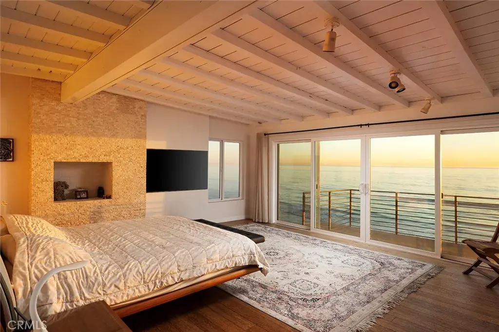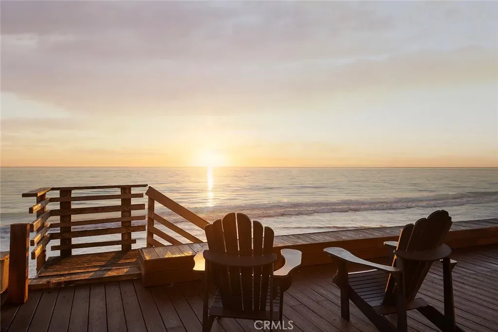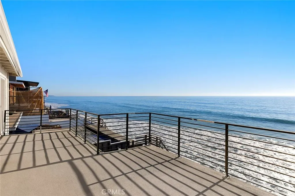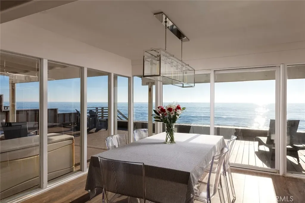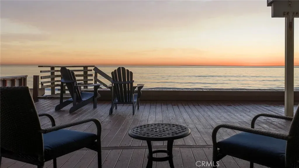 Mixing the appeal of a classic beach house with desirable Mid-Century Modern design, this beautiful home offers an on-the-sand setting with panoramic ocean, coast and whitewater views. Located on guard-gated Beach Road in Dana Point’s Capistrano Beach, the bright and spacious residence presents ocean views upon entry that enrich main living areas and span spectacular sunsets, Catalina Island, Dana Point Headlands, and evening lights that shimmer on the waves after sunset. Mid-Century design cues are evident in a floorplan of approximately 2,473 square feet that has an easy, open flow and large windows, all while preserving privacy. Custom glass entry doors lead to a living room with a floor-to-ceiling stacked-stone fireplace and sliding-glass doors opening to a large deck. Framed by walls of windows on three sides, the dining room also offers deck access and is perfect for casual get-togethers, celebrations, holidays and more. It flows seamlessly to an open kitchen with white cabinetry, glass uppers, granite countertops, and a full package of stainless-steel appliances complete with an under-counter beverage refrigerator. For added convenience, a luxuriously remodeled bath with outdoor access is located in the attached three-car garage, making it easy to enjoy a quick after-beach rinse before coming indoors. The four-bedroom, three- and one-half bath design continues upstairs, where a skylight illuminates the staircase. Each bedroom is spacious and comfortable, and the fully upgraded guest bath displays two sinks, a soaking tub and a walk-in shower with frameless glass enclosure. Homeowners will reap the rewards of a primary suite with stunning 180º ocean views both inside and outside on an expansive balcony overlooking the beach. The suite encompasses a sitting area, contemporary stone fireplace, versatile flex room that also leads to the balcony, an ensuite bath and a walk-in closet. Refinements are led by beamed ceilings, woodgrain-tile downstairs and genuine hardwood upstairs, custom built-ins, modern lighting fixtures, recessed LED lighting, glass roll-up garage doors, and metal and glass wardrobe doors. Approximately 2,090 square feet, the homesite continues to the median high-tide line on the beach and includes an oversized main-level view deck with sun and shade areas and stairs leading to the sand. Additional private parking joins a storage building directly across the street.