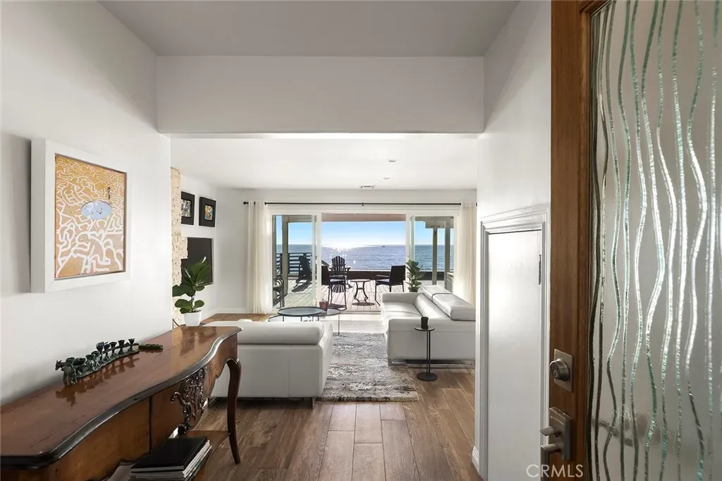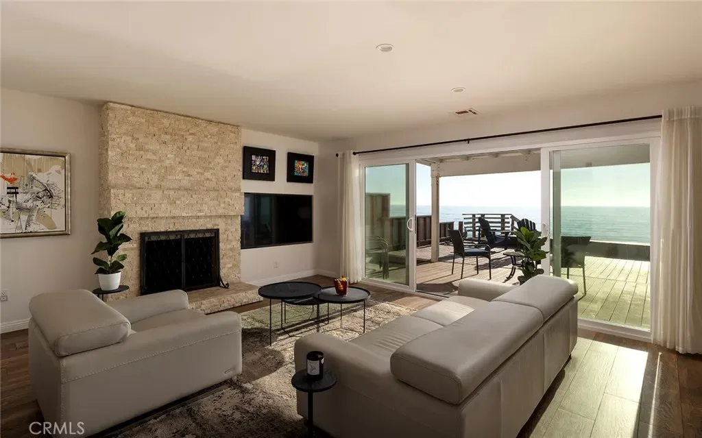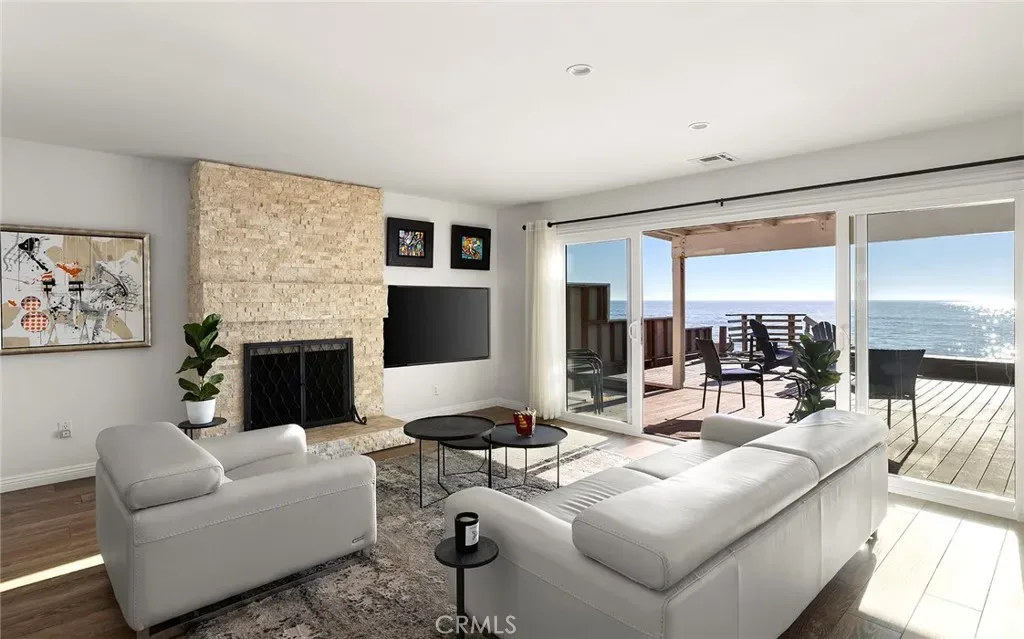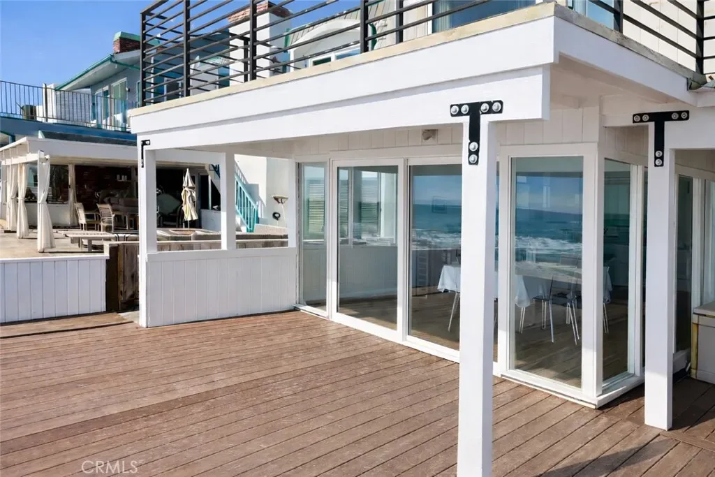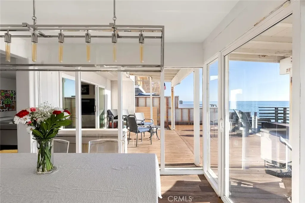 Mixing the appeal of a classic beach house with desirable Mid-Century Modern design, this beautiful home offers an on-the-sand setting with panoramic ocean, coast and whitewater views. Located on guard-gated Beach Road in Dana Point’s Capistrano Beach, the bright and spacious residence presents ocean views upon entry that enrich main living areas and span spectacular sunsets, Catalina Island, Dana Point Headlands, and evening lights that shimmer on the waves after sunset. Mid-Century design cues are evident in a floorplan of approximately 2,473 square feet that has an easy, open flow and large windows, all while preserving privacy. Custom glass entry doors lead to a living room with a floor-to-ceiling stacked-stone fireplace and sliding-glass doors opening to a large deck. Framed by walls of windows on three sides, the dining room also offers deck access and is perfect for casual get-togethers, celebrations, holidays and more. It flows seamlessly to an open kitchen with white cabinetry, glass uppers, granite countertops, and a full package of stainless-steel appliances complete with an under-counter beverage refrigerator. For added convenience, a luxuriously remodeled bath with outdoor access is located in the attached three-car garage, making it easy to enjoy a quick after-beach rinse before coming indoors. The four-bedroom, three- and one-half bath design continues upstairs, where a skylight illuminates the staircase. Each bedroom is spacious and comfortable, and the fully upgraded guest bath displays two sinks, a soaking tub and a walk-in shower with frameless glass enclosure. Homeowners will reap the rewards of a primary suite with stunning 180º ocean views both inside and outside on an expansive balcony overlooking the beach. The suite encompasses a sitting area, contemporary stone fireplace, versatile flex room that also leads to the balcony, an ensuite bath and a walk-in closet. Refinements are led by beamed ceilings, woodgrain-tile downstairs and genuine hardwood upstairs, custom built-ins, modern lighting fixtures, recessed LED lighting, glass roll-up garage doors, and metal and glass wardrobe doors. Approximately 2,090 square feet, the homesite continues to the median high-tide line on the beach and includes an oversized main-level view deck with sun and shade areas and stairs leading to the sand. Additional private parking joins a storage building directly across the street.