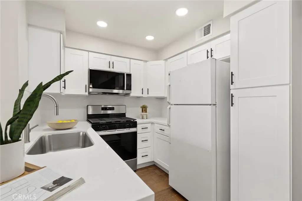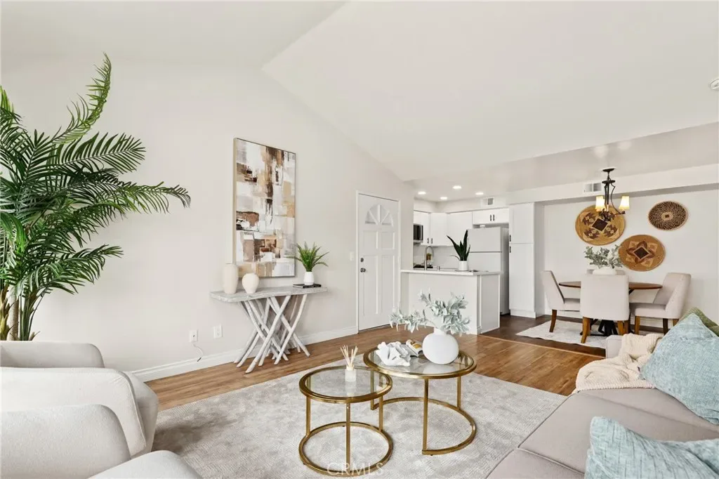 Perched on the top floor in the desirable Harbor Walk community, this beautifully upgraded 1-bedroom, 1-bath residence offers approximately 700 square feet of light-filled living space with a fresh, modern feel throughout. Soaring cathedral ceilings enhance the open layout, while fresh interior paint and updated flooring create a clean, move-in-ready environment. The inviting living room flows seamlessly into a charming dining area and extends to a full-length private balcony —perfect for relaxing or entertaining. The remodeled kitchen is a standout feature, showcasing rich quartz countertops, white cabinetry, and ample workspace for both everyday living and hosting. The serene primary suite features vaulted ceilings, a spacious closet, and a well-appointed en-suite bathroom with quartz surfaces and a mirrored vanity. Additional highlights include an assigned parking spot and guest parking along with access to the community pool. Ideally located just about a mile from the beach, with quick access to the 5 Freeway and surrounded by an abundance of shopping and dining options, this home offers an exceptional blend of comfort, style, and coastal convenience.