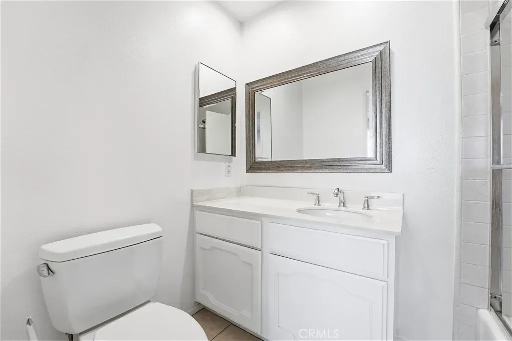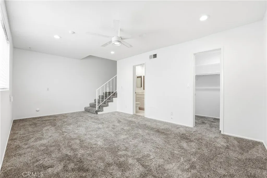 The second level serves as the main living area and includes two bedrooms with generous closet space and sliding glass doors that open to a private backyard patio. One of these bedrooms also features an en suite bathroom, offering an additional primary suite option.
