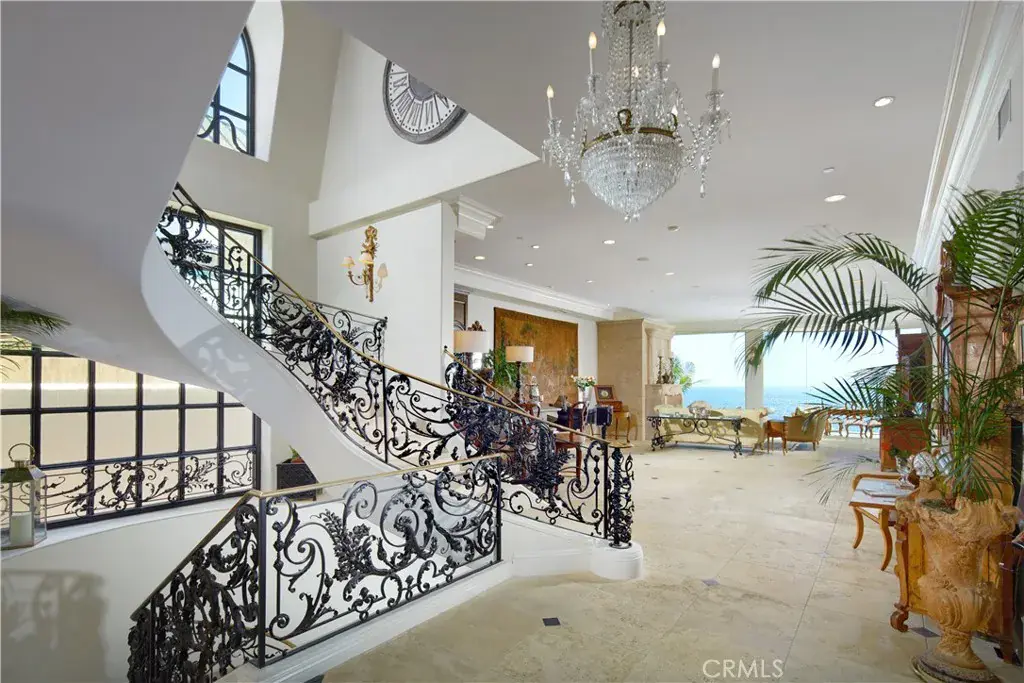This European-inspired oceanfront home by interior designer Sue McKeehan and Architect Marshall Ininns is in the 24-hour guard gated beachfront community of Niguel Shores in Monarch Beach. Infused with antique details and the finest finish materials, the old world feeling is evident everywhere in the home, starting in the entry courtyard with its black and white marble floor, 12-foot high wrought iron and glass doors, and kitchen with an antique sway-backed French basin inserted into an old French chopping block. The endless panoramic views mesmerize from all three levels of the house; on the main floor, the sheer wall of glass allows the sun and water to filter into the kitchen and living room areas that are adjacent to it, on the upper level the oceanfront primary suite feels like you are on the bridge of an ocean liner, and from the lowest floor, the family room looks out onto the water and from this level one can walk out to the outdoor living space with its fireplace pool and steps to the private beach. The home’s main level features untreated marble, a large great room with an antique fireplace, and the kitchen, which has a sweeping view and is perfect for everyday living and hosting on a grand scale. The home’s upper level features three family bedrooms with en-suite baths, a study, and a dramatic primary suite with a retreat, fireplace, and elegant marble bath. The lower level of the home is all about entertaining with a theater, gym, wine room, guest suite, and playroom with a bar, built-ins, and a huge entertaining room. Niguel Shores is an active lifestyle community with private beach access, a clubhouse, a swimming pool, tennis courts, pickleball courts, playground, and numerous athletic amenities. All the fun of the beach is outside your door, swimming, surfing, paddle boarding, volleyball, and just an easy walk to the world famous Ritz Carlton Hotel.