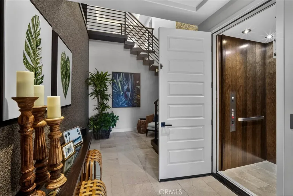 Upon entry, an impressive foyer leads upstairs via staircase or private elevator, opening to a dramatic single-level layout designed for both grand entertaining and relaxed coastal living. Statement stonework, designer wall treatments, and curated accent lighting add depth and character throughout. The great room flows seamlessly to the ocean-view balcony, where sunset skies and cool coastal breezes become part of the daily rhythm.