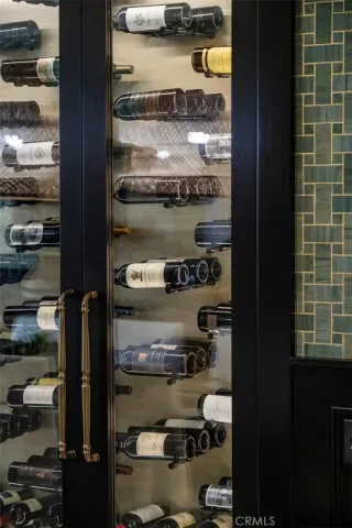 The kitchen is outfitted for the serious home chef, anchored by an oversized island with seating and a premier Sub-Zero and Wolf appliance suite, including a steam oven, built-in espresso system, and secondary wine refrigeration. A formal dining room is complemented by a striking, temperature-controlled wine display holding more than 200 bottles, ensuring the home remains a natural gathering place for intimate dinners and larger celebrations alike.