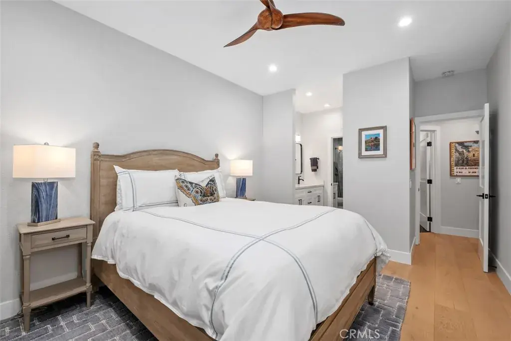 This open-concept home features newly replaced hardwood floors, updated interior/exterior doors and beautiful custom windows, recessed lighting throughout, and a two-way gas fireplace with bi-fold glass doors. Modern kitchen includes quartz countertops, custom cabinetry, bar seating, and recently updated appliances: 6-burner range, dishwasher, disposal, microwave, refrigerator, and interior stacked washer/dryer.