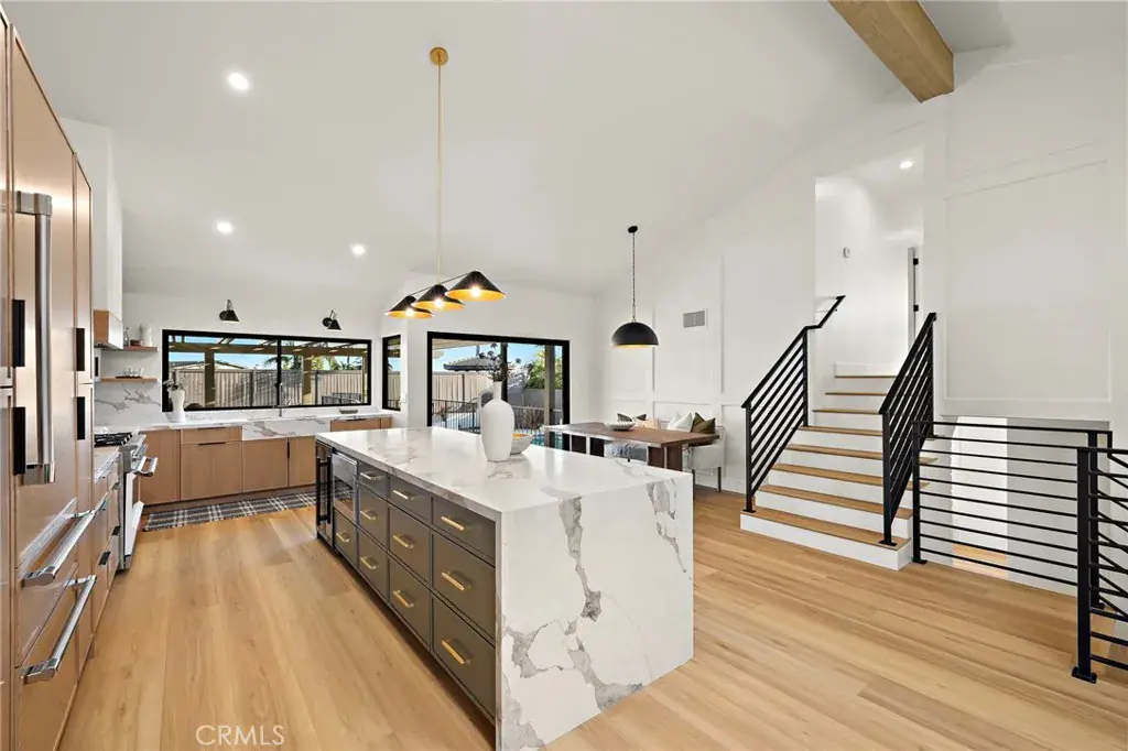 Located in a coveted coastal Dana Point neighborhood, this extensively renovated residence was thoughtfully reimagined by local designer Karen Olson of Inspired Coastal Designs. The home was redesigned with an airy, open-concept kitchen and living room layout, introduced by newly installed statement 8′ French entry doors. The fireplace was elegantly reworked with smooth stucco, a granite hearth, and inset television. Stunning Opulux LVP wide plank flooring and slate tile extend throughout the home. The chef’s kitchen is nothing short of striking, showcasing custom rich toned cabinetry, “Rainbow” quartz countertops and backsplash, premium appliance package, and a generous island equipped with a microwave drawer and beverage refrigerator. Throughout the home, custom white oak interior doors, including pocket doors, slatted wood wall accents, and impressive 18′ custom wainscoting introduce texture and warmth. The lower level includes a newly added powder room and a fully appointed laundry room featuring slate flooring, new cabinetry, custom shelving, and new LG washer and dryer. A pool and recreation room provides an ideal lounge space for kids, with direct access to the backyard. Just beyond, a bedroom with a newly finished en-suite bath offers versatility as a bedroom or home office, complete with direct pool views. Upstairs, the primary bedroom offers ample space and is bathed in natural light from multiple windows. The primary bathroom is bold and spa-like, with a show stopping nine foot double shower with rain feature, slab wrapped walls, a heated toilet, custom vanity, and thoughtfully curated designer mirrors and lighting. A newly constructed walk-in closet completes the primary suite. Two additional bedrooms, each offering ocean views, share a full bath featuring Terrazzo style tile and statement lighting and mirror designs. Enjoy ocean breezes in the expansive and private backyard, offering a large covered patio, a grassy area with plenty of room to play, a sparkling pool and spa, and updated landscaping including new trees, shrubs, and planter boxes. Additional enhancements include new ducting & venting, fresh exterior paint, including the garage doors and black window trim. Located just minutes from local parks, shopping, restaurants, Dana Point Harbor, and top rated schools, this home represents a meticulously executed renovation within one of Dana Point’s most established and desirable coastal neighborhoods.