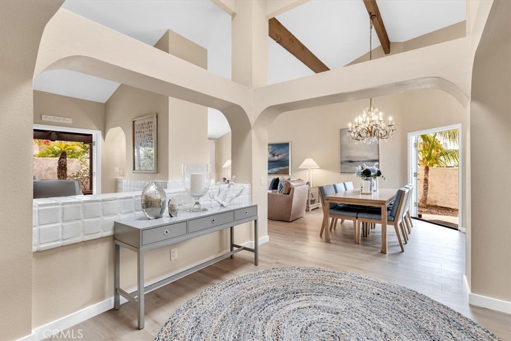 Enter through a charming wrought iron gate into a lush, private courtyard adorned with tropical landscaping and a brick patio. At its heart, a clover-shaped spool with a pergola offering shaded seating, ideal for relaxing or entertaining.A grand wooden door opens into a spacious foyer with blonde wood floors and cathedral ceilings with a skylight flooding the entry with natural light. To the right, a gourmet kitchen boasts granite countertops, built-in refrigerator, dishwasher, oven, and a generous island with electric cooktop and storage. French doors connect the kitchen to the courtyard and spool—perfect for indoor-outdoor living.Through a pocket door, is the formal dining room featuring a chandelier and French doors opening to a secluded side yard. Adjacent, the elegant living room centers around a sleek gas fireplace with white tile surround creating a warm and relaxing gathering space. French doors open to the back patio, where tropical landscaping, covered deck, and a gas fire pit enhance the coastal ambiance.A partial wall divides the living room from a cozy inglenook with a two-sided fireplace, built-in chestnut shelving. There are additional french doors in the nook to the outdoors, inviting in the ocean breeze.Down the hall, the secondary bedroom includes mirrored closet doors, private entry from the courtyard, and continuous blonde wood flooring. The adjacent guest bath features a tub/shower combo, long counter, and dedicated vanity space.At the end of the hall, the primary suite impresses with a dramatic mirrored accent wall and French doors to the patio. A sliding barn door reveals the ensuite bath with dual sinks, vanity area, and three mirrored closets. A separate door leads to a large soaking tub/shower.Situated on a desirable corner lot, this home enjoys the resort-style amenities of Niguel Shores, including a private ocean bluff with beach access, pickleball and tennis courts, bocce ball, pool and spa, playgrounds, and clubhouse.Steps outside the community are two 5 star resorts within walking distance, Salt Creek Beach, and Downtown Dana Point and Harbor.