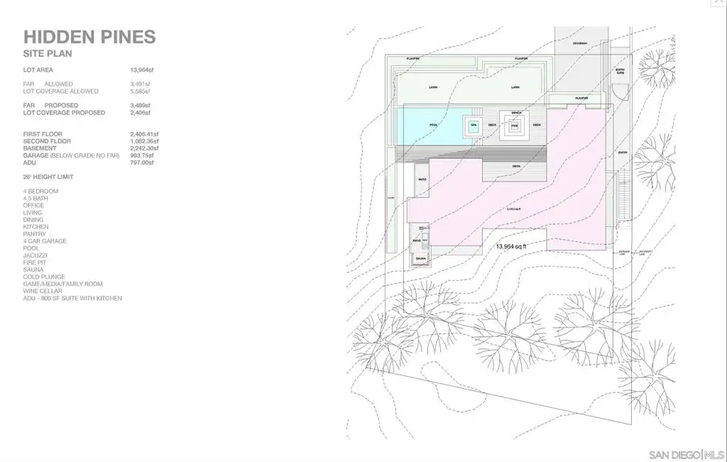 Welcome to Hidden Pines, a serene and tucked-away lot in one of Del Mar’s most coveted neighborhoods. This rare offering blends seclusion and privacy with easy access to everything that makes Del Mar and North County San Diego so desirable. The Property Set on a 13,964 sq. ft. parcel and zoned R1-10, Hidden Pines presents an exceptional opportunity to design your dream coastal retreat. Conceptual renderings (not yet approved) envision a 3,488 sq. ft. custom residence with three bedrooms and three and a half baths, spacious living and dining areas, a gourmet kitchen with pantry/cellar, and a seamless flow to outdoor spaces designed for entertaining. Additional features include a below-grade 994 sq. ft. four-car garage and a 797 sq. ft. ADU suite with a full kitchen — ideal for guests, extended family, or a private office. Planned resort-style amenities include a pool, jacuzzi, fire pit, sauna, and cold plunge, creating a true wellness retreat at home. Seller Credit To bring your vision closer to reality, the seller is offering a construction credit of $800 per square foot for all built space — including the main home, garage, and ADU. With a total of 5,279 sq. ft. proposed, this equates to a credit of approximately $4.2 million. This extraordinary contribution allows you to focus on creating the finishes, details, and personal touches that will make this home distinctly yours. The Lifestyle Perched to capture sweeping Pacific Ocean views, Hidden Pines offers the perfect canvas to embrace Del Mar’s coastal lifestyle. Step outside your door and onto the…See supplement The Lifestyle Perched to capture sweeping Pacific Ocean views, Hidden Pines offers the perfect canvas to embrace Del Mar’s coastal lifestyle. Step outside your door and onto the trails of the Torrey Pines Reserve Extension. Within minutes, stroll the world-famous beaches of Del Mar, explore the dramatic beauty of Torrey Pines State Reserve, or experience the excitement of the iconic Del Mar Racetrack. Quick access to I-5 and the Solana Beach Train Station ensures effortless commuting or weekend escapes to San Diego, Orange County, or Los Angeles. Your Opportunity This is a rare chance to secure a piece of Del Mar’s coastal charm — an inspiring canvas for the home you’ve always imagined, supported by an unparalleled construction credit to make it possible.