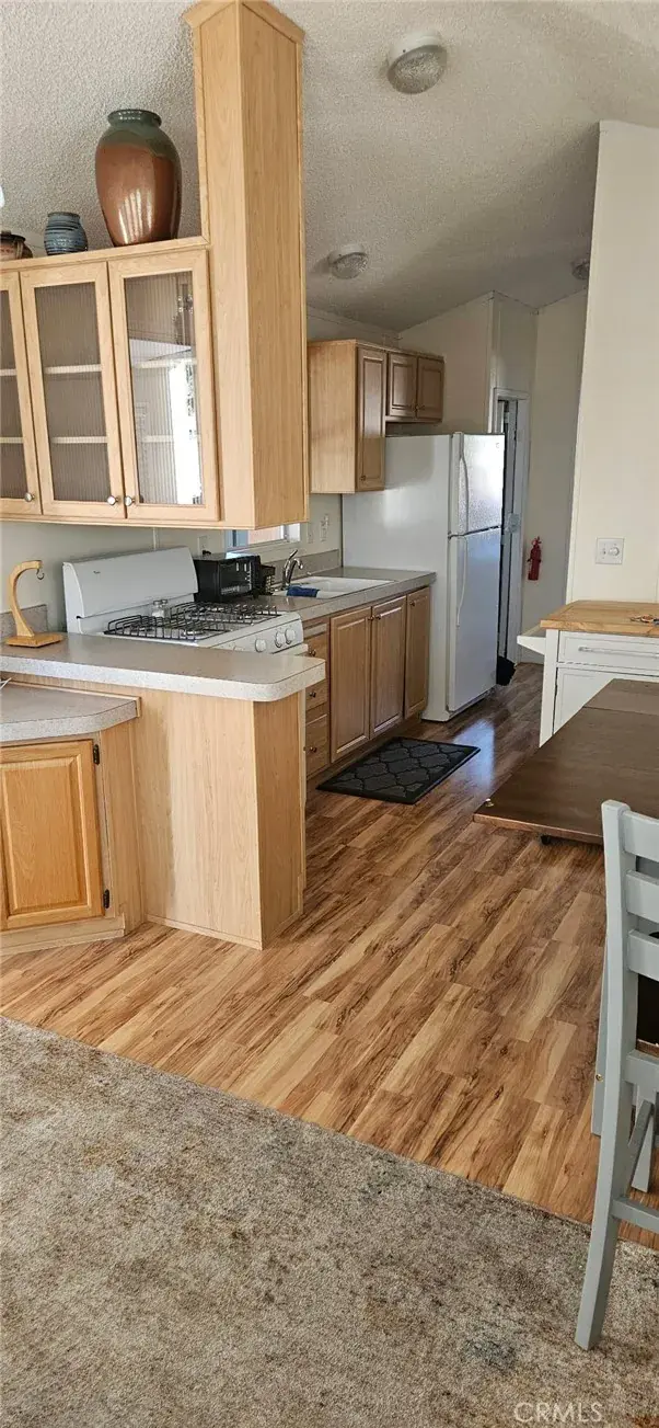 Inside, you’ll enjoy the convenience of a full-sized kitchen with a standard stove and refrigerator, plus an in-unit washer and dryer. The extended carport runs the length of the home, providing shaded parking for up to two vehicles.
