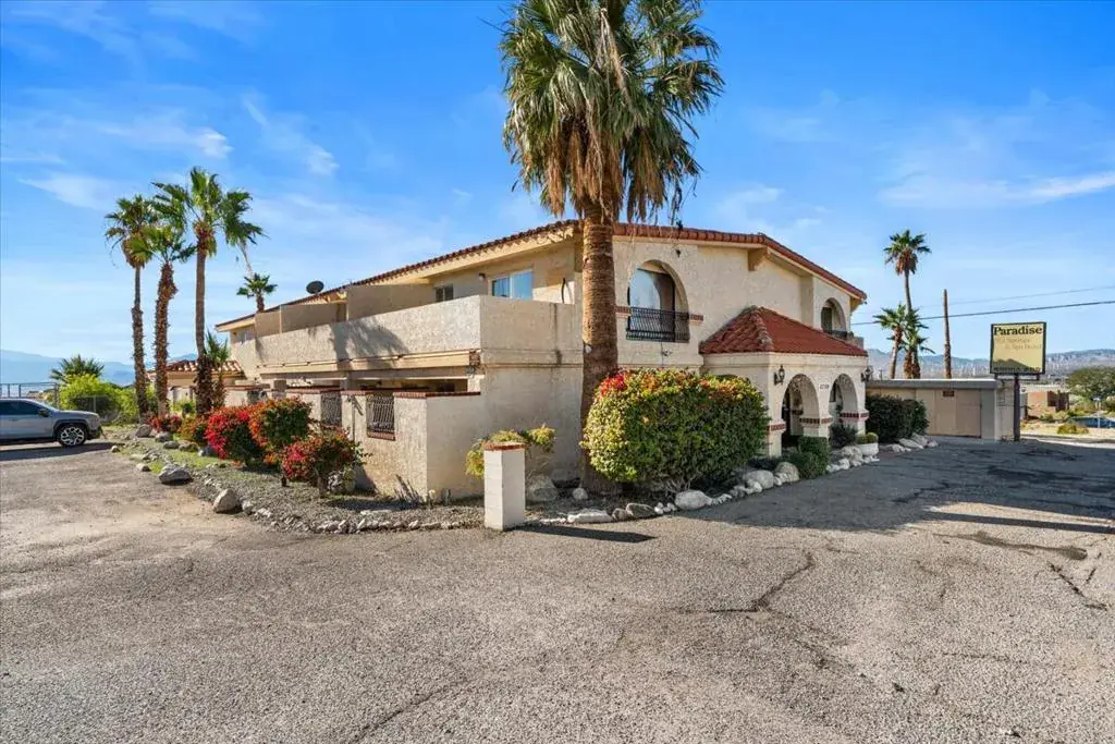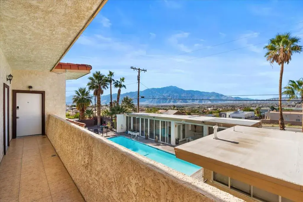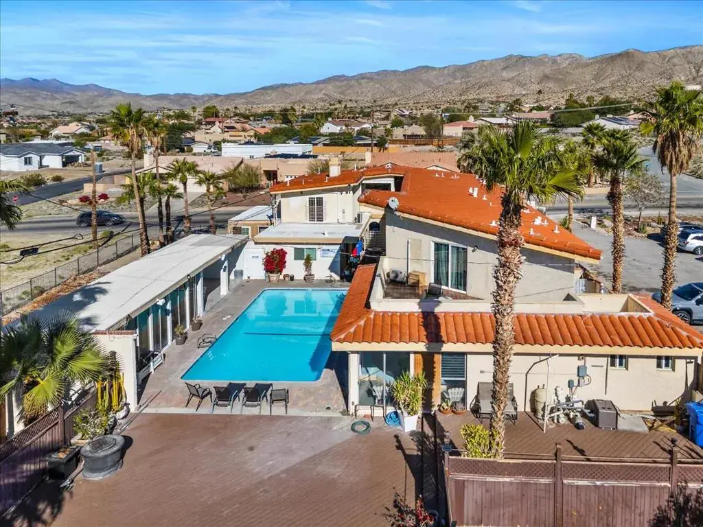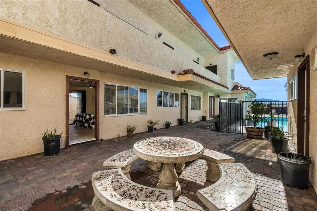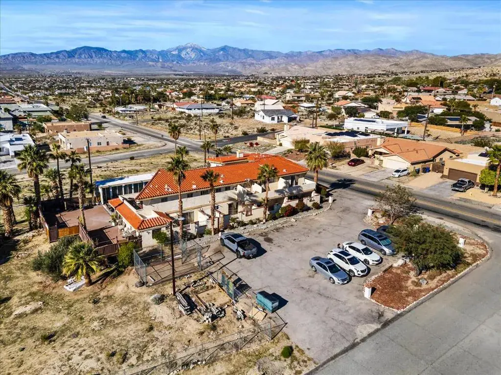 Located high up in Desert Hot Springs on Hacienda Avenue in Hacienda Heights area., this twelve room facility has the advantage of views. Complete with large private court- yard pool and hot water spa set off in a private room. It has a large shower room adjacent to the Spa.. It is situated in the Hot water zone sections of Desert Hot Springs but was capped off a few years ago, reasons unknown. The temperature in this sector is 102 degrees and may require a ”Cold water mixer” to reduce the temperature as it enters the spa. Not a difficult adjustment if the new owner wished to have the geo-thermal water the city is named after and famous for. The property was built on the slope of a hill. You enter the lobby, office area at street level. The Spanish Mediterranean structure is horse shoe shaped with the rooms down below on the side of the pool. The guest rooms contain double queen beds and each have an adjoining small kitchen plus a large private covered patio, basically a mini-suite. The resort is handled much like an Airb&b with electronic door locks. The owners are not on property but control all arrivals/ departures electronically. The reservation goes to the owner, who takes the credit card information or wire transfer, Once verified the entrance code is relayed to guest who checks into their assigned room. A house keeper is on property to assist as well as a handyman for maintenance. Upon departure day the guestroom is electronic closed and housekeeping restores the room for arriving guests. There is a washer/dryer area for guests use as well as a small kitchen pool side empty dining room for guests snacks. Very private.