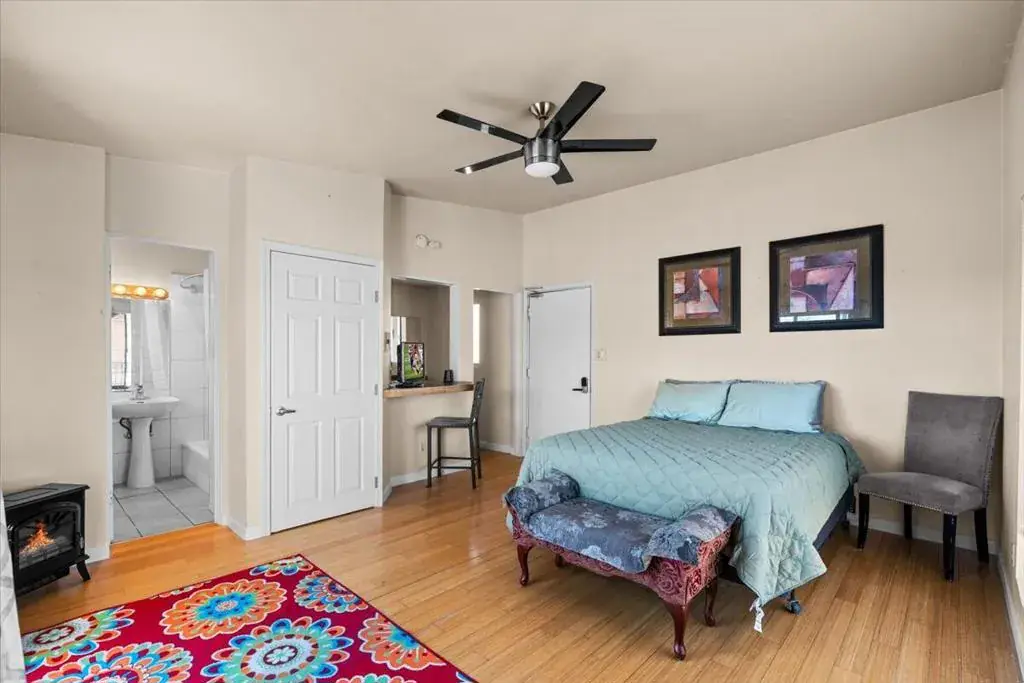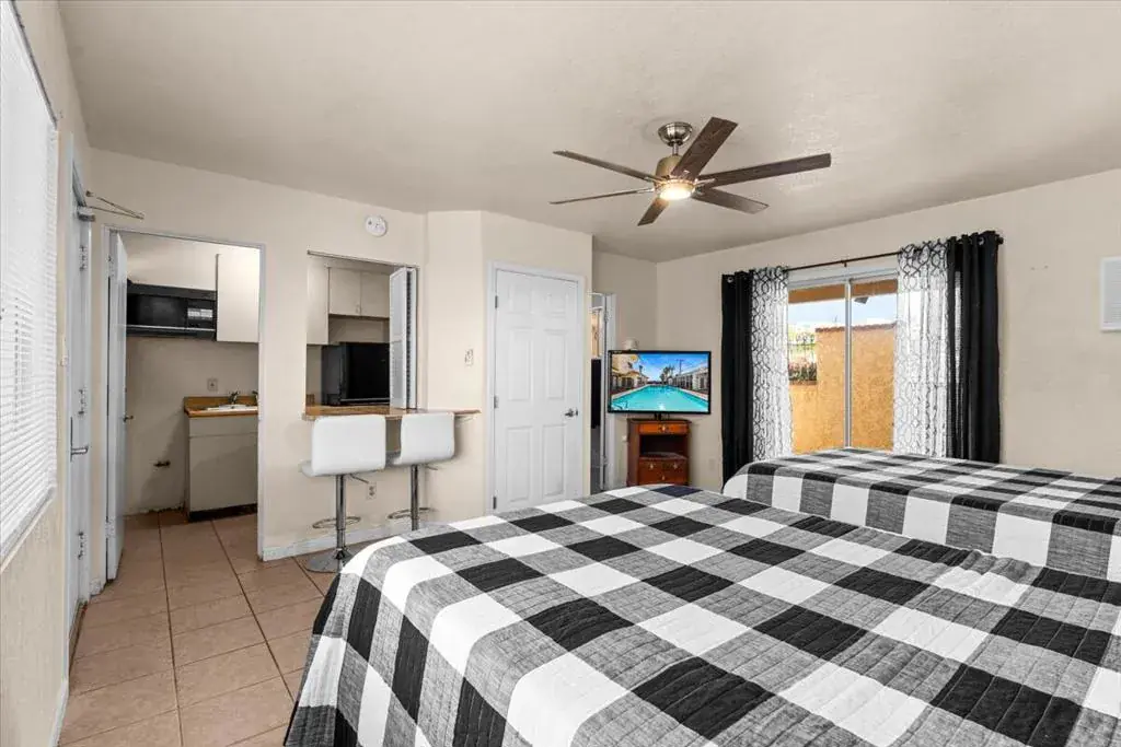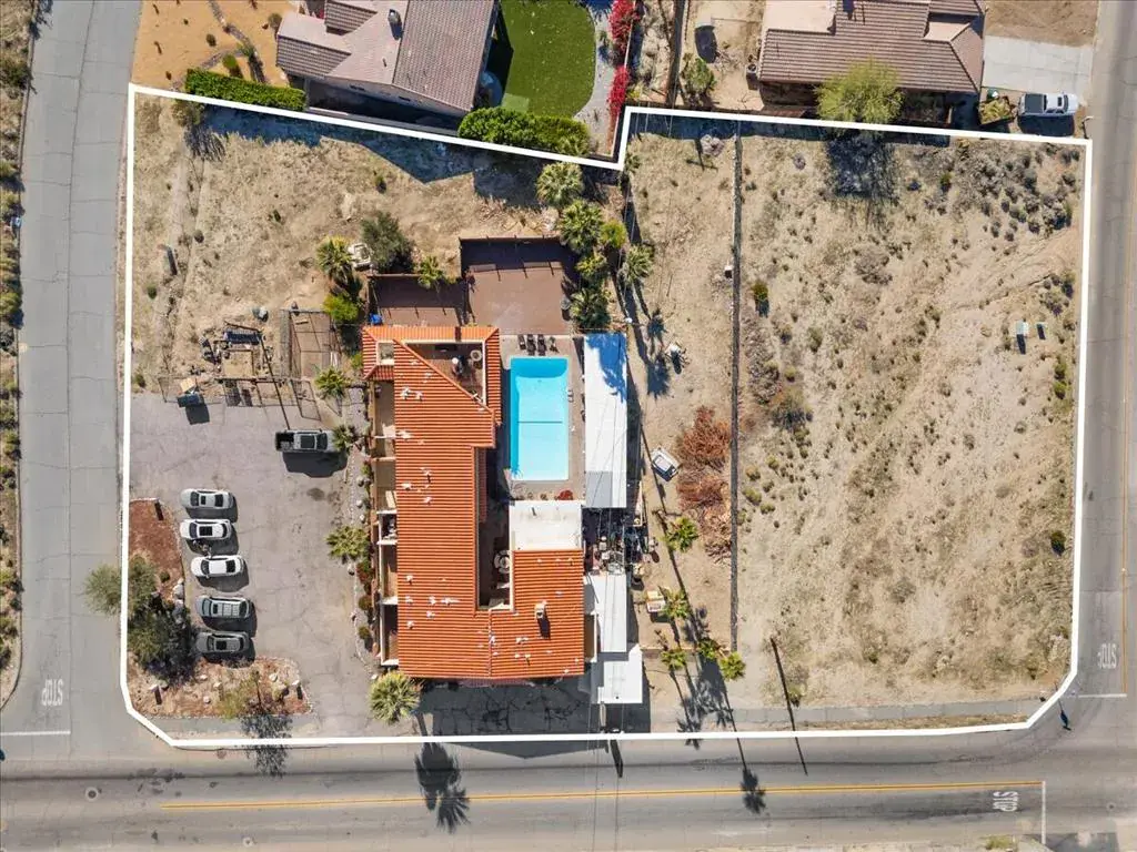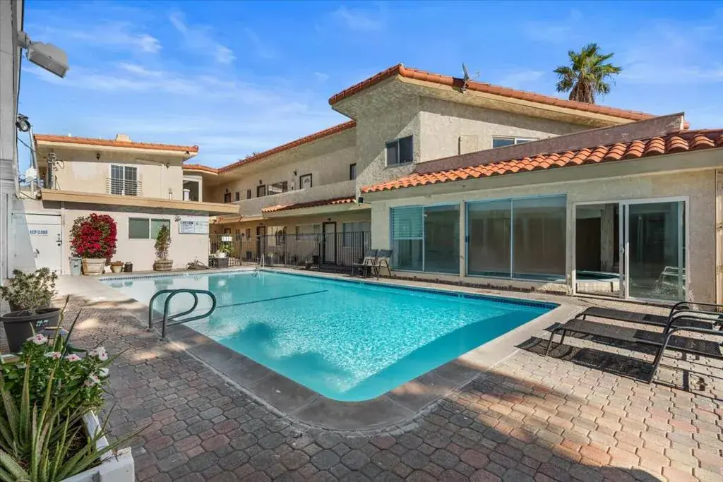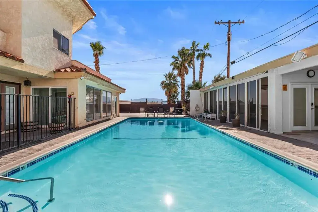 Located high up in Desert Hot Springs on Hacienda Avenue in Hacienda Heights area., this twelve room facility has the advantage of views. Complete with large private court- yard pool and hot water spa set off in a private room. It has a large shower room adjacent to the Spa.. It is situated in the Hot water zone sections of Desert Hot Springs but was capped off a few years ago, reasons unknown. The temperature in this sector is 102 degrees and may require a ”Cold water mixer” to reduce the temperature as it enters the spa. Not a difficult adjustment if the new owner wished to have the geo-thermal water the city is named after and famous for. The property was built on the slope of a hill. You enter the lobby, office area at street level. The Spanish Mediterranean structure is horse shoe shaped with the rooms down below on the side of the pool. The guest rooms contain double queen beds and each have an adjoining small kitchen plus a large private covered patio, basically a mini-suite. The resort is handled much like an Airb&b with electronic door locks. The owners are not on property but control all arrivals/ departures electronically. The reservation goes to the owner, who takes the credit card information or wire transfer, Once verified the entrance code is relayed to guest who checks into their assigned room. A house keeper is on property to assist as well as a handyman for maintenance. Upon departure day the guestroom is electronic closed and housekeeping restores the room for arriving guests. There is a washer/dryer area for guests use as well as a small kitchen pool side empty dining room for guests snacks. Very private.