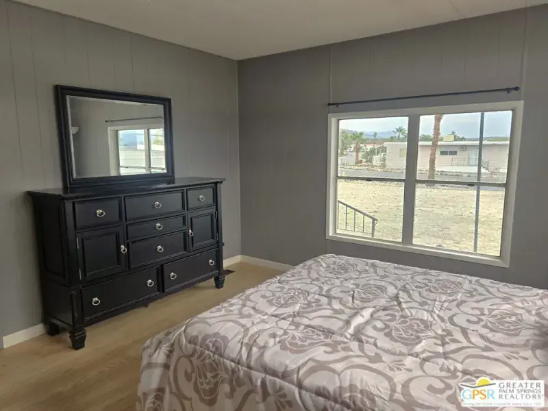 YOU OWN THE LAND!! and more of it than most, since this property occupies a larger than usual lot in the Active 55+ Community of Desert Crest Country Club. Seller has marked the approximate lot line so you can see the possibility of expanding the outdoor patio space or maybe adding additional parking for an RV. You enter the home from a large raised concrete patio that just calls out for a glass of wine and a cheese platter. What a place to entertain your friends! This home has been completely remodeled and features a brand-new Kitchen with new appliances. The high-end countertops even have a custom cut drain board next to the sink! You will love the bright and airy main Living Room which is combined with the Dining Area and Kitchen to have a Great Room feel, and please notice the new light wood flooring throughout. The Master Bedroom includes an ensuite Bath and walk-in closet, while the secondary bedroom features a jack-and-jill Bath that can also act as a Powder Room for guests. You are going to love the oversized garage with tandem parking for two and plenty of shop and storage space left over! Don’t miss the large enclosed shop area at the back of the garage which gives you so much extra inside space. Desert Crest Country Club is a senior 55+ community with an array of exclusive amenities. Challenge friends to a round on the par-3 Golf Course or unwind in the Natural Mineral Spring Water Pool and Spas. There are several Shuffleboard courts that are covered, so you can play year-round. The community’s commitment to a luxurious lifestyle is evident in every detail of the expansive Clubhouse. This home is more than just a place to live; it’s a gateway to a lifestyle of peace, luxury, and contentment. Low HOA dues and YOU OWN THE LAND complete this residence into the ultimate package! Enjoy your new home today!