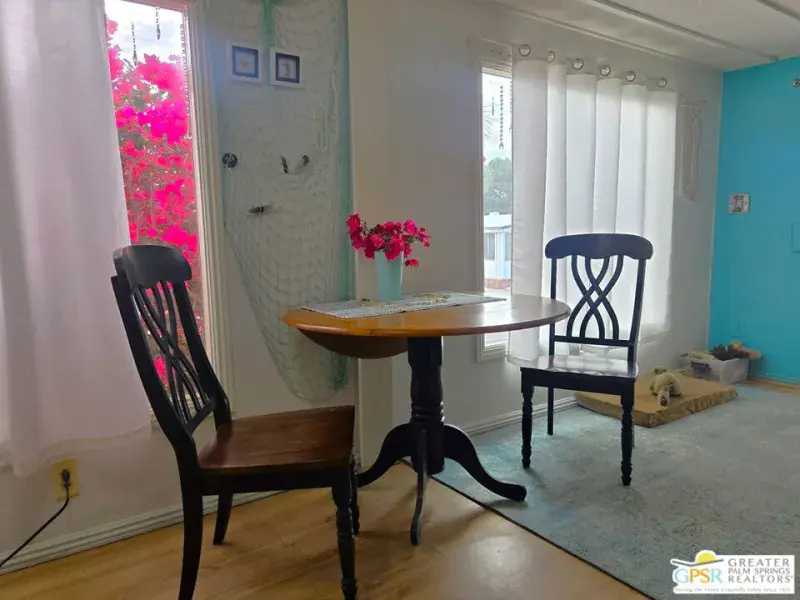 Welcome to *THE MERMAID HOUSE*, a Two Bedroom, Two Bath home with a Bonus Room added just off of the Master. This home has been decorated to bring the feel of the sea to you. You have just the right sized cozy space inside, and an immense outdoor rear area to stamp with your own style. Views of Mounts San Jacinto and San Gorgonio, and the Banning Pass await you outside. With easy access to nearby conveniences and attractions in the Coachella Valley, residents enjoy the accessibility of city living amenities while still being able to enjoy country tranquility. This 2 Bedroom, 2 Bath home that is just the right size at 854 SF is located in the North and Central section of Desert Crest Country Club, and is just down the way from both the Par-3 Golf Course and the Clubhouse with natural mineral spring water Pool & Spas. Whether you are looking for a permanent residence or a vacation home, this property offers the perfect combination of comfort, convenience, and charm. Parking is amazing with both a covered Carport and an additional parking Driveway. Coming inside the direct access Entry Doorway into the Living Room you enjoy an open living concept across the front of the home, with large Windows and the Slider Door Entry giving lots of natural lighting. The Kitchen has great space to prepare to entertain your family and guests, with a wraparound Breakfast Bar central area and tile countertops done right with custom tile inserts. Full cooking facilities are available in the Kitchen including the natural gas Range, Dishwasher and spacious Refrigerator completing what you need to entertain. You have great separation of public and personal spaces. The ensuite Master Bedroom & Bath has just what you need with the addition of a downstairs Bonus Room enlarging the space, and the second Bedroom and Bath are comfy and cozy. The Rear Yard is a blank slate ready for you to realize your dream of relaxing in privacy. Desert Crest Country Club is a wonderfully Active 55+ Community that provides all the activities you want. The Desert Crest Country Club community boasts a 9-hole par-3 golf course, inviting residents to enjoy free leisurely rounds amid the picturesque setting of pond and mature trees that boast views of Mounts San Jacinto and San Gorgonio and the iconic windmills of the Banning Pass. This oasis extends beyond the golf course. Residents here enjoy a multi-faceted Clubhouse featuring a healthy mineral water Pool and Spas, providing a serene escape and a hub for plenty of social connections. Indoor Shuffleboard and other activities are a welcome diversion here at the Clubhouse, with many interior facilities to keep you moving and fit. The onsite cafe caters to culinary cravings, the dog groomers attend to furry companions, and the real estate office ensures all needs are met with ease. These conveniences foster not just a residence but a sense of belonging within a home and community bound by shared experiences and vibrant camaraderie. This home represents a harmonious blend of comfort, style, and functionality, creating a delightfully private haven within the heart of Desert Crest Country Club. Whether indulging in a round of golf, luxuriating in the mineral water pool, playing shuffleboard, or simply savoring the serenity of the surroundings from your very private rear deck, this property offers a unique and fulfilling 55+ living experience, where every moment is the essence of a life well-lived!