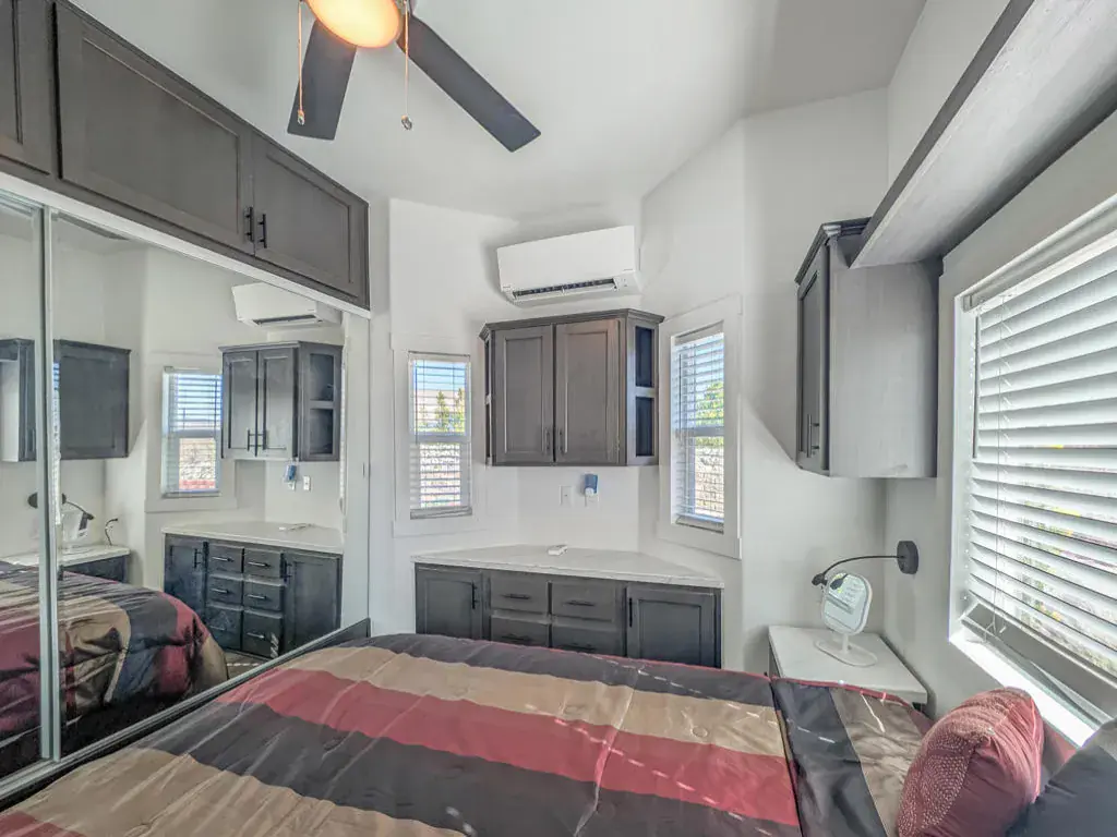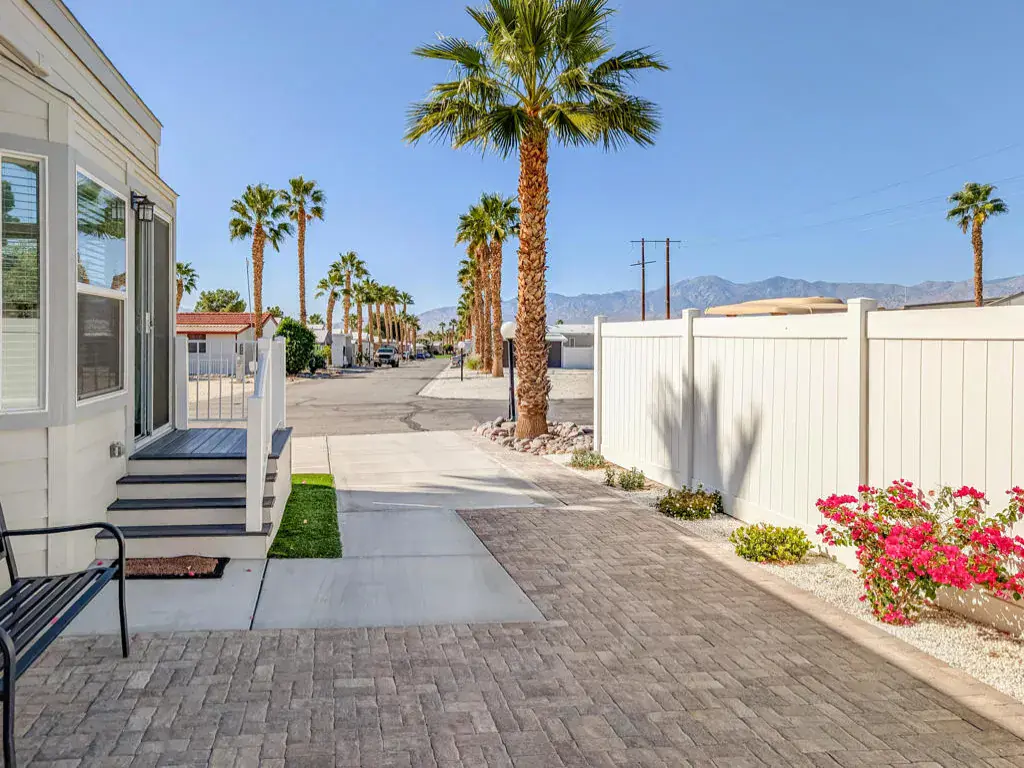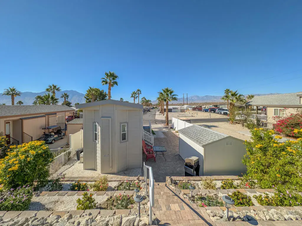 Presenting an exceptional opportunity to own a pristine 2023 Cavco Park Model, ideally suited as a primary residence or vacation retreat in the desert. This well-appointed home offers approximately 400 sq. ft. of efficiently designed living space featuring one bedroom and one bathroom. The interior boasts premium upgrades, including dark cabinetry, contemporary finishes throughout, and modern appliances, such as a built-in dishwasher. Climate control is ensured year-round with ductless heating and cooling. Additional highlights include volume ceilings and a generously sized stamped paved driveway. Enjoy sweeping views of Mt. San Jacinto from the main living area as well as outdoor areas of this remarkable space. The property is situated on a desirable lot within the park, enhanced by mature landscaping and a terraced, paved backyard that is ideal for entertaining or stargazing. Recent improvements feature drought-tolerant plantings and an outdoor area tailored for relaxation and social gatherings. This residence is offered fully furnished for immediate occupancy. Caliente Springs Resort provides residents with outstanding amenities, comprising a mineral hot spring-fed pool and spas, a fitness center, a 9-hole golf course, 8 pickleball courts, tennis courts, laundry facilities, a library, and chapel services. The vibrant community setting presents ample opportunities for social engagement. Please note: Park approval is required prior to submitting an offer. The lot is leased; monthly space rent is $707.