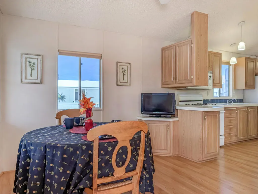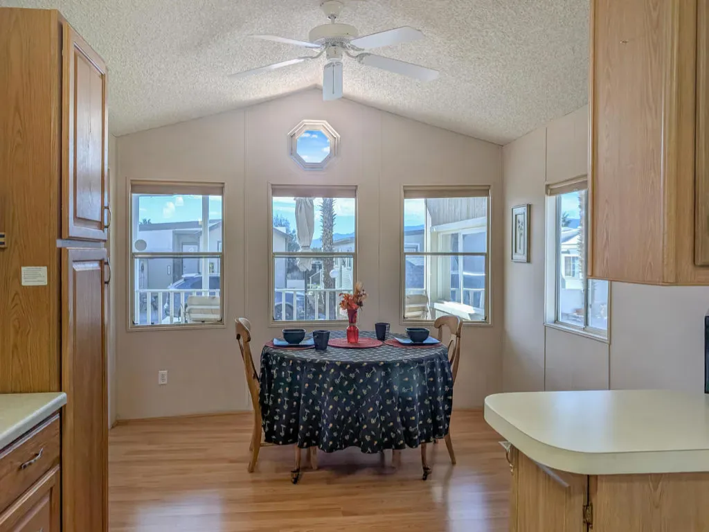 Charming and well-appointed 2001 Fleetwood Park Model home is now available in the 55+ Caliente Springs Resort. The resort offers amenities such as a hot mineral-fed pool and spas, a 9-hole golf course, a fitness center, laundry facilities, and a library. This property includes ~600 sq. ft., a 1 bedroom, 1 bathroom home with wood flooring throughout, upgraded cabinets and counters, ample storage, and views of San Jacinto and the Little San Bernardino Mountains from inside the home and on the covered deck. This home is suitable for either a seasonal getaway or full-time living. The community is very active and involved. Please note that the lot is not owned; space rent is $673.