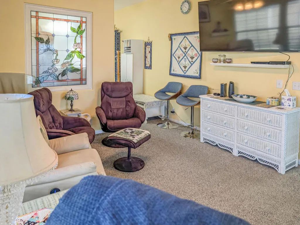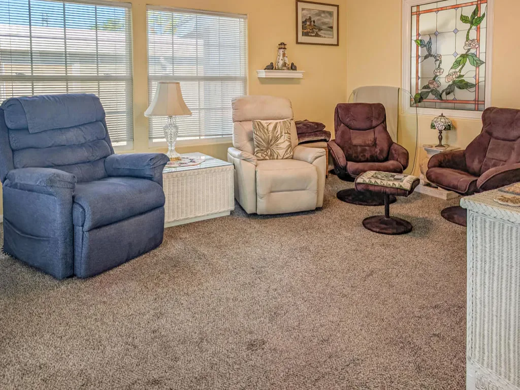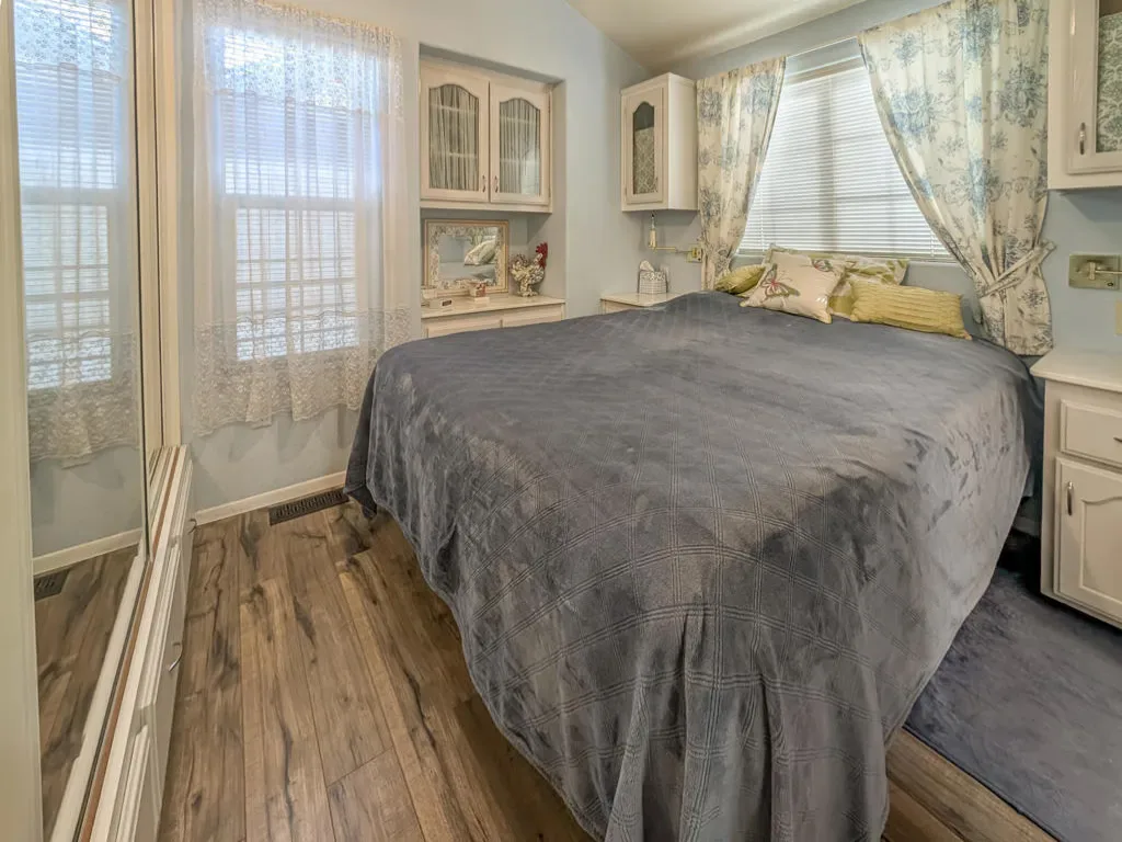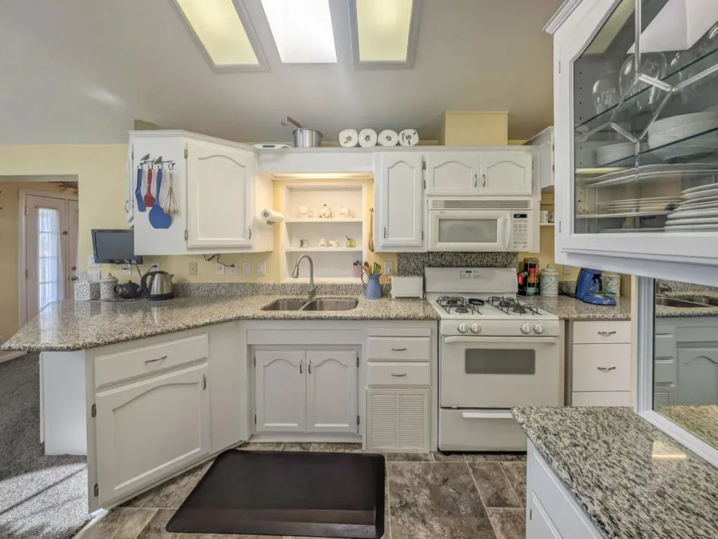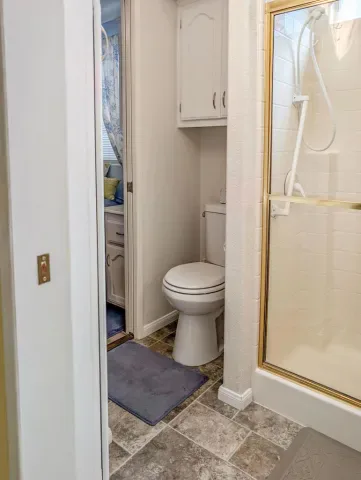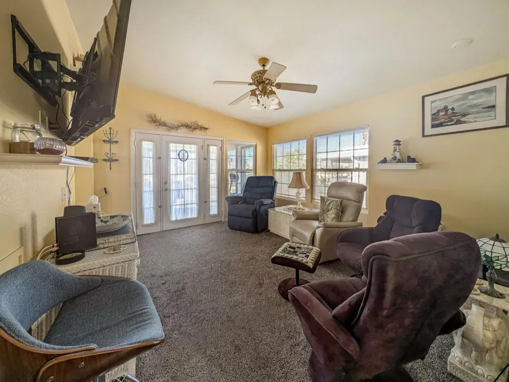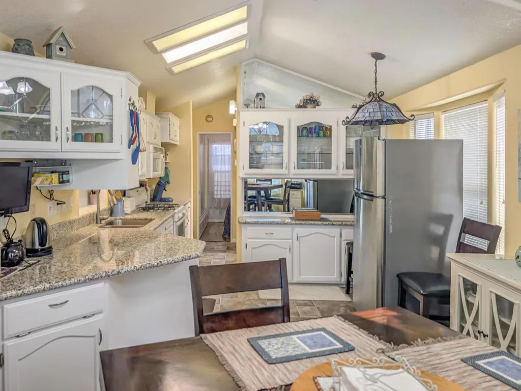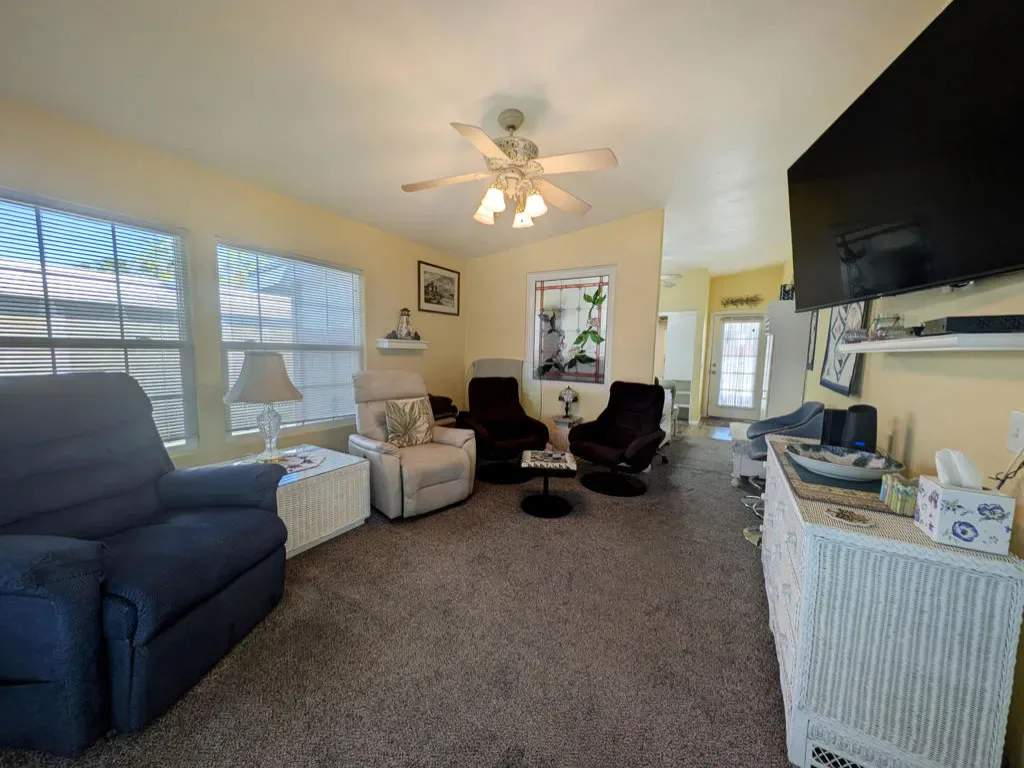 This attractive property sits right on the 8th hole of the golf course and boasts beautiful southern views and impressive water features. Located in the well-regarded 55+ Caliente Springs Resort, the well-kept, 2002 Hallmark Park Model with a stick built California room offers around 700 square feet of living space with one bedroom and 1 1/2 bathrooms. It includes quality flooring throughout, marble countertops, energy-efficient double pane windows, a washer and dryer housed in an outside shed, and freshly painted cabinets. Residents can relax or entertain year-round on the spacious, fully covered deck with wind walls–perfect for sunset views. There is a carport and lovely stamped/paved drive. The resort is packed with amenities, including a mineral hot spring-fed pool and spas, a modern fitness center, a 9-hole golf course, pickleball and tennis courts, laundry facilities, a library, and a vibrant social scene. Please note, the lot is leased, not owned, with a monthly space rent of $950.