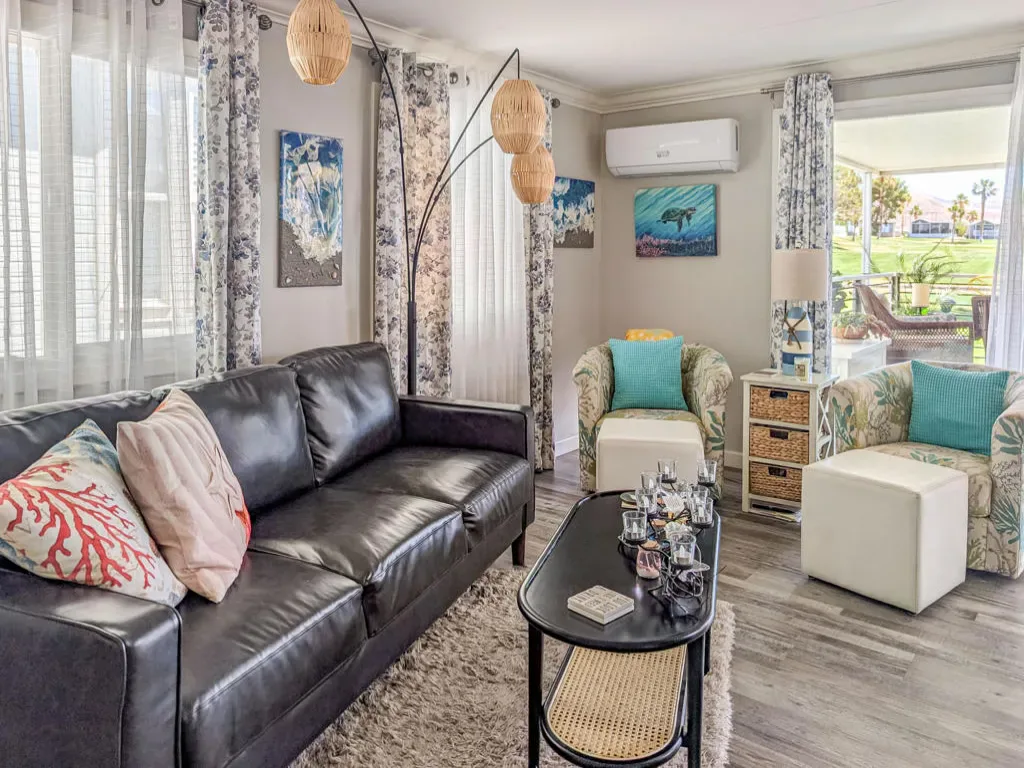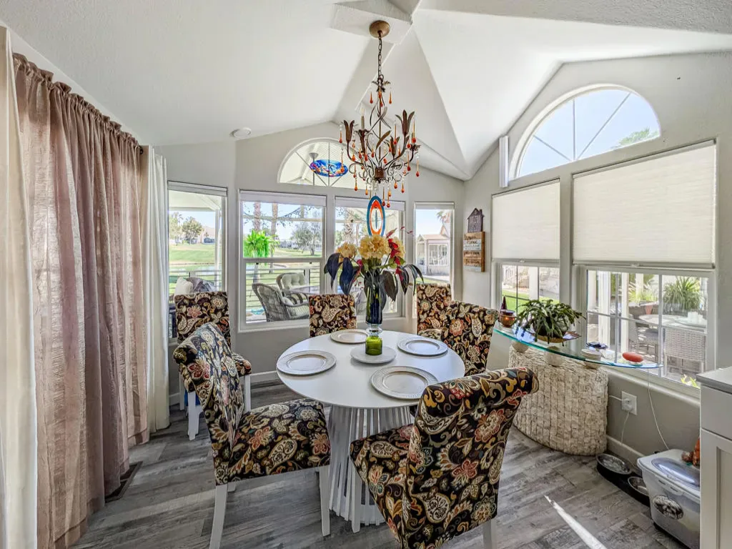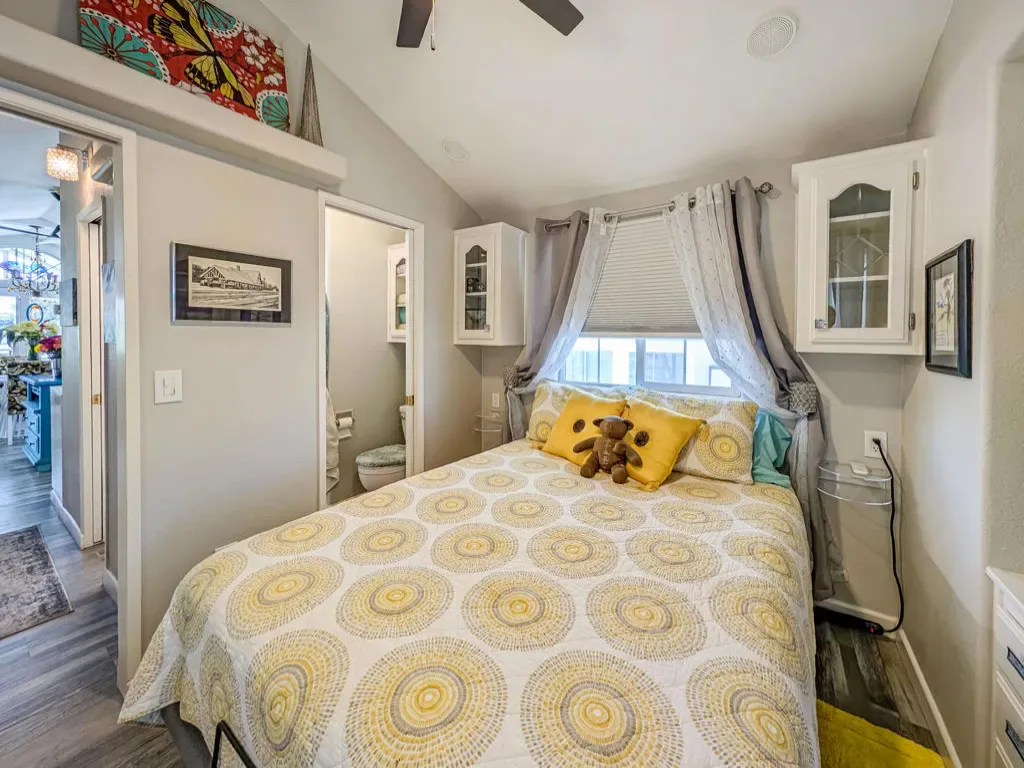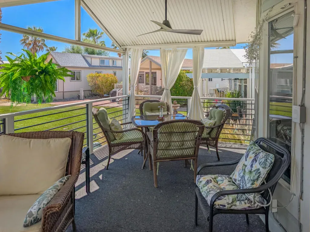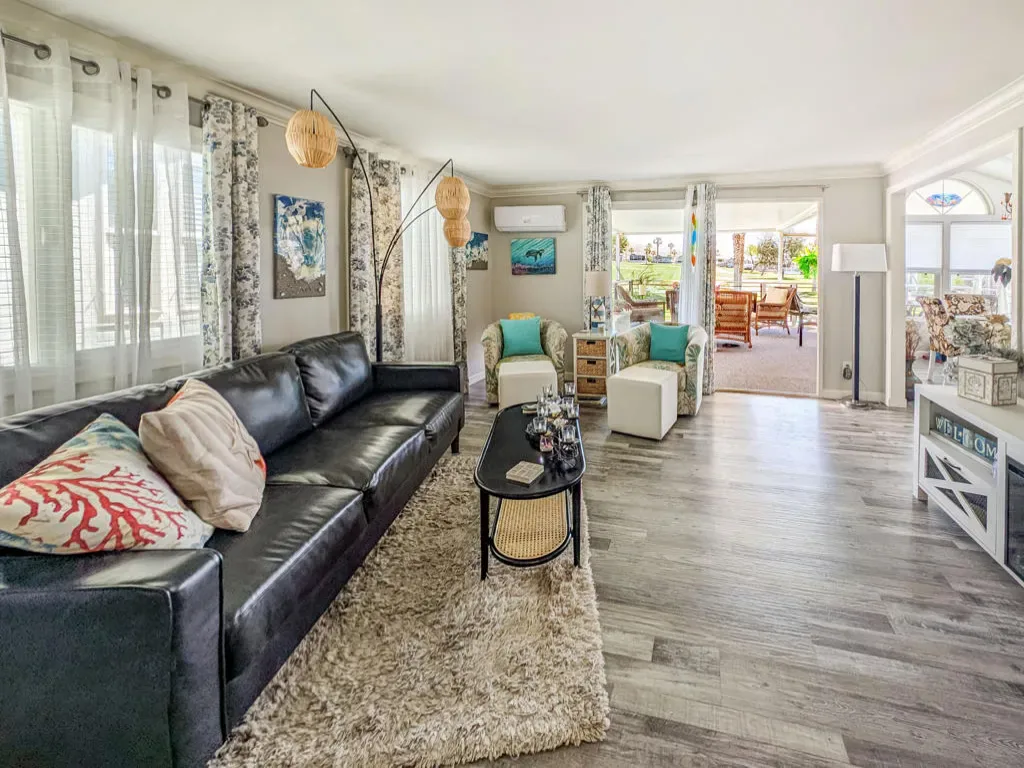 This is a truly unique gem, beautifully maintained and visually striking! The 2002 Hallmark Park Model offers about 800 sq. ft., with 2 bedrooms and 2 bathrooms, and is located on the sought-after 8th hole of the golf course. It has been custom remodeled with features designed to satisfy every need, including designer paint throughout, upgraded backsplashes in the kitchen and bathroom, luxury vinyl plank flooring, stainless-steel appliances (including an efficient dishwasher), a doggie door with a private enclosed run, a paved carport, white-coated roof, and a mini-split system in the spacious, bright California room. There’s also a stunning large deck, covered and sheltered from the wind, where you can enjoy breathtaking views and the relaxing sounds of the water feature and greens–making it perfect for entertaining year-round! Caliente Springs is a premier 55+ resort that provides amenities such as a 9-hole golf course, 8 pickleball courts, tennis courts, laundry facilities, a library, and a vibrant community full of events and friendly faces. Come see this well-appointed home and make it your vacation retreat or your permanent residence! Please note: the lot is not owned; space rent is $950.