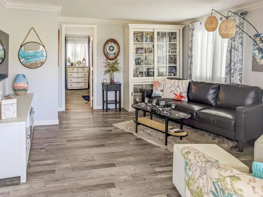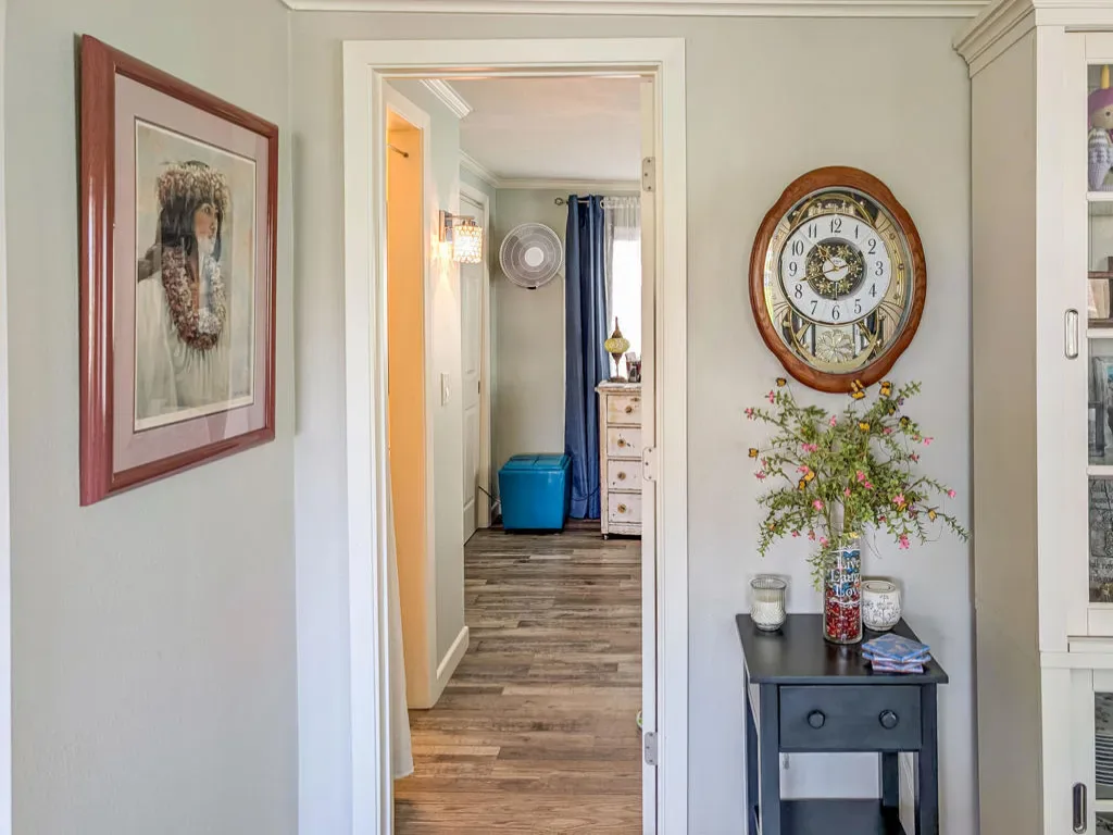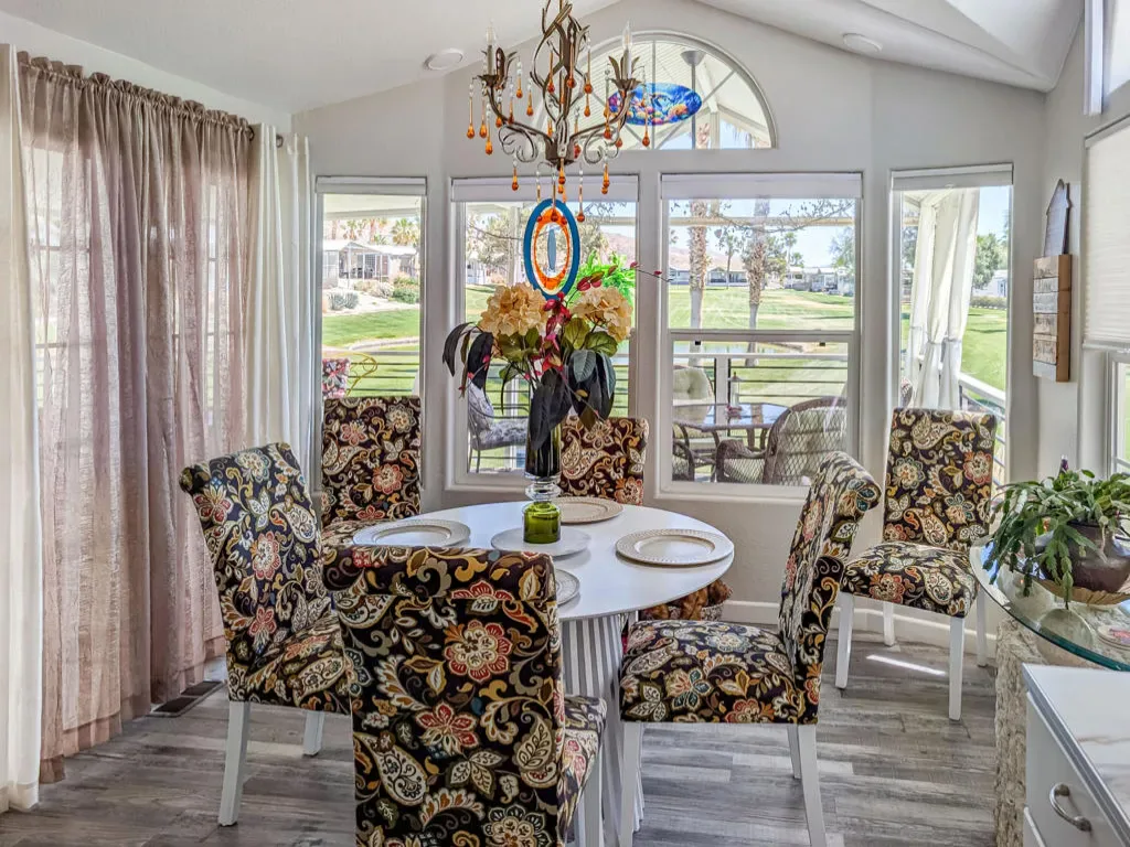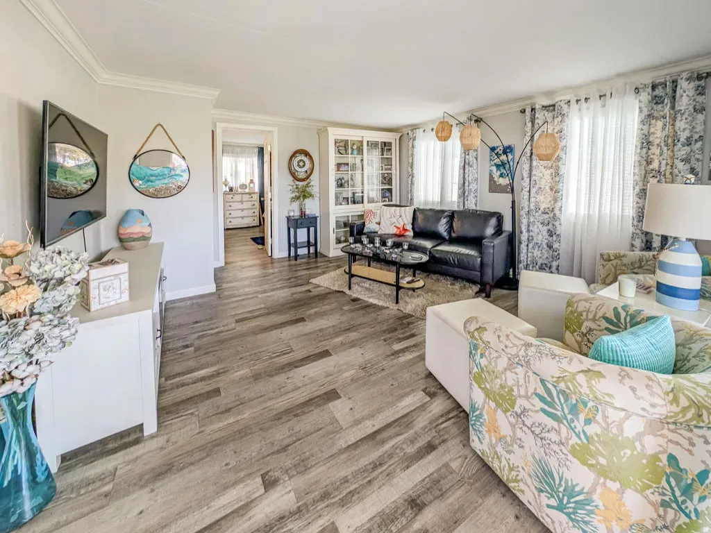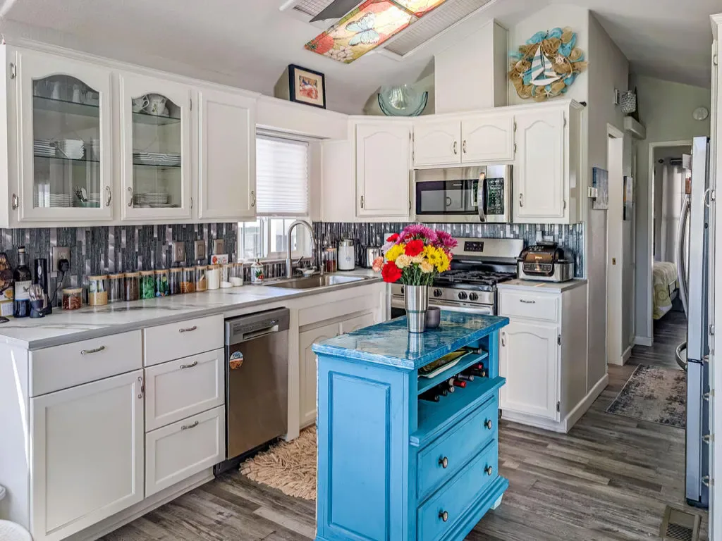 This is a truly unique gem, beautifully maintained and visually striking! The 2002 Hallmark Park Model offers about 800 sq. ft., with 2 bedrooms and 2 bathrooms, and is located on the sought-after 8th hole of the golf course. It has been custom remodeled with features designed to satisfy every need, including designer paint throughout, upgraded backsplashes in the kitchen and bathroom, luxury vinyl plank flooring, stainless-steel appliances (including an efficient dishwasher), a doggie door with a private enclosed run, a paved carport, white-coated roof, and a mini-split system in the spacious, bright California room. There’s also a stunning large deck, covered and sheltered from the wind, where you can enjoy breathtaking views and the relaxing sounds of the water feature and greens–making it perfect for entertaining year-round! Caliente Springs is a premier 55+ resort that provides amenities such as a 9-hole golf course, 8 pickleball courts, tennis courts, laundry facilities, a library, and a vibrant community full of events and friendly faces. Come see this well-appointed home and make it your vacation retreat or your permanent residence! Please note: the lot is not owned; space rent is $950.