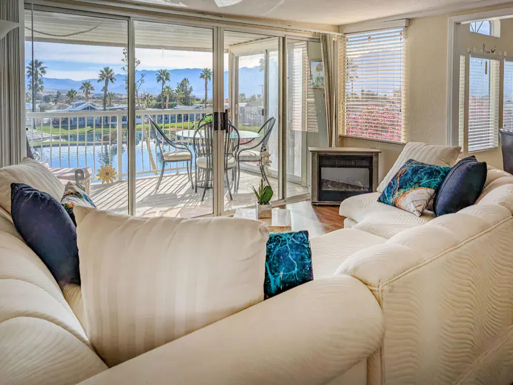 Unbelievable sweeping views from all around in this stunning Skyline Park Model with ~800 sq. ft., 2 large bedrooms (queen and king), 1.5 bathrooms, large bathroom has double sinks, walk-in shower, and marble counter tops. This fantastic and sleek home features a full-size gas hot water tank, newer floors, electric fireplace to keep you warm on chilly mornings or evenings, a beautiful dining room table with a leaf and six chairs, and a sofa bed for additional sleeping area, kitchen has dishwasher and garbage disposal. Oversized California room comes equipped to block the sun with tasteful awnings and furnishings throughout, the shed is insulated with power, a 1/2 carport, 2014 golf cart (worth 5k). Step out onto the fully covered deck overlooking the 4th hole on the golf course with ponds and Mt. San Jacinto in the backdrop! All this is being offered now in the exquisite 55+ Caliente Springs Resort. The park boasts top notch amenities including mineral hot spring fed pool and spas, state of the art fitness center, 9-hole golf course, pickleball courts, tennis court, laundry facilities, library, and a fun active community. Lot is not owned; space rent is $950 (subject to change). Easy lender financing (OAC).