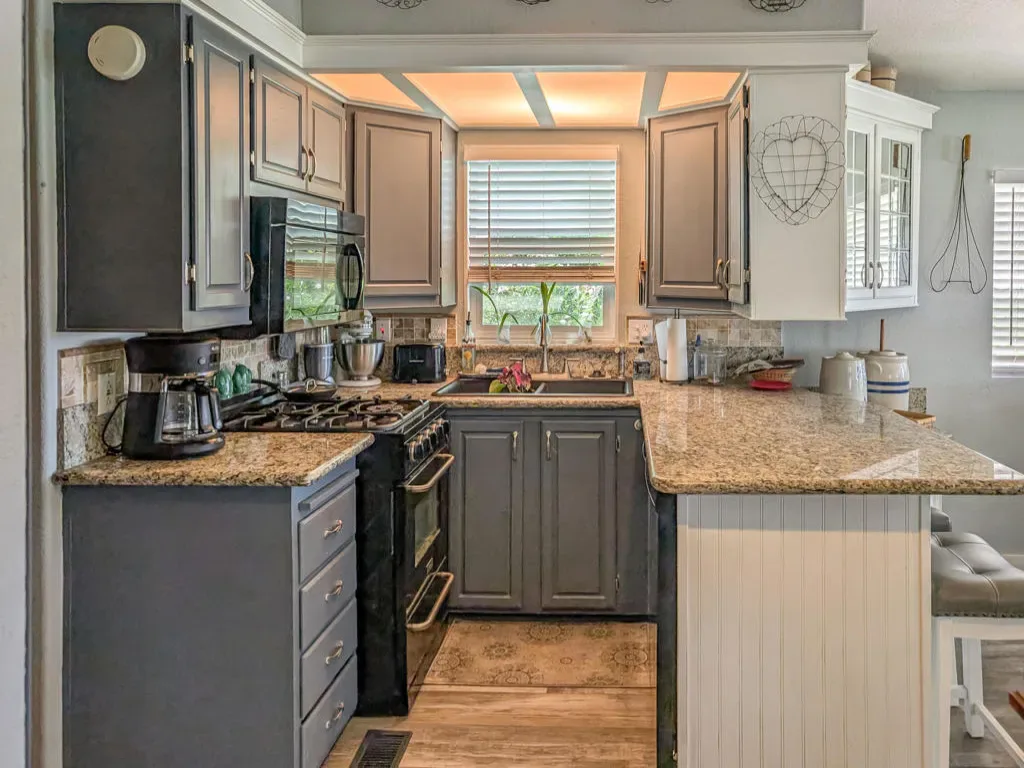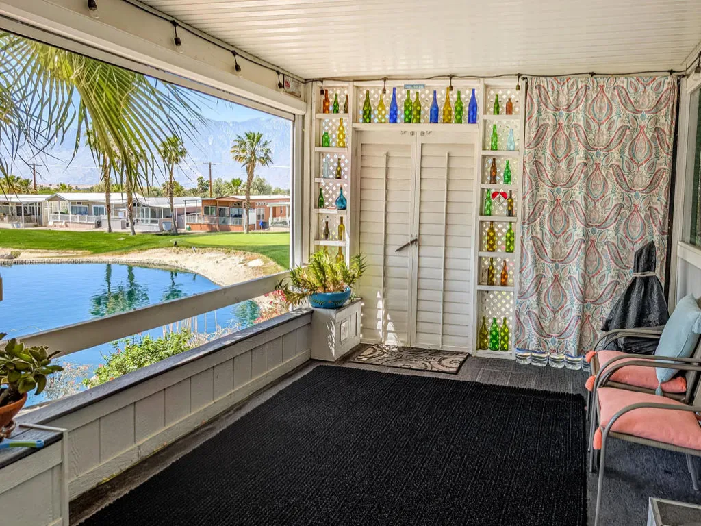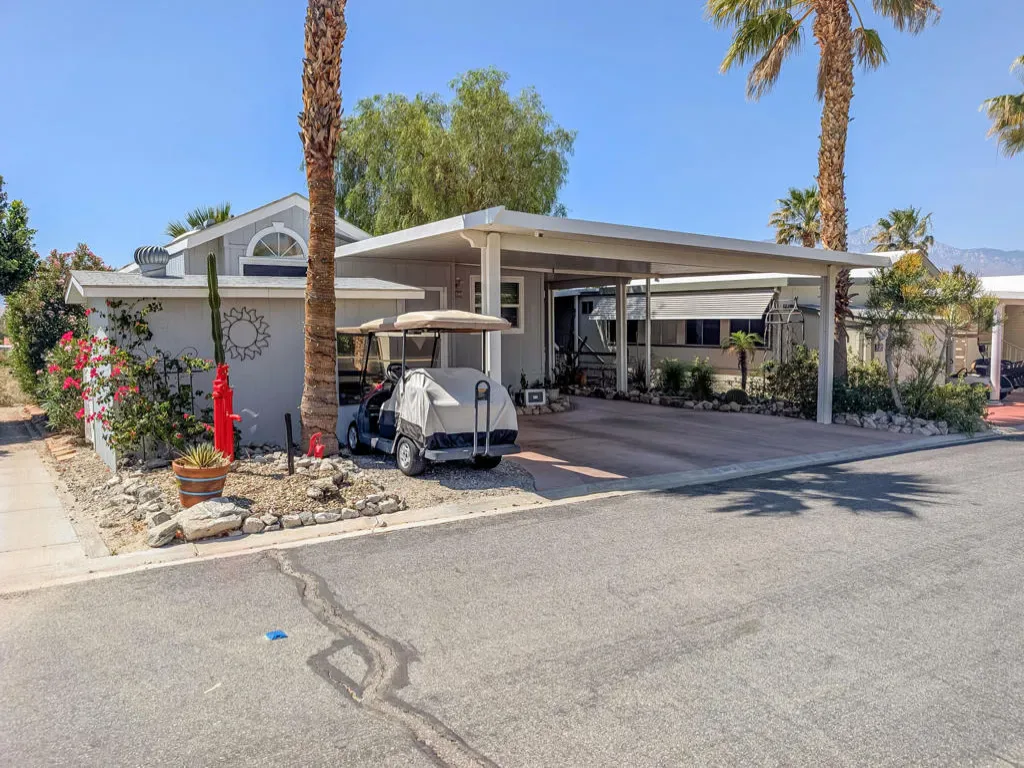 This extensively renovated 2-bedroom, 1-bath park model home encompasses approximately 800 square feet and features impressive mountain views along with pristine water features, situated on the 4th hole of the golf course. The property includes a well-designed two-car covered carport and golf cart, complemented by a California room constructed with quality craftsmanship and tasteful updates throughout, such as granite countertops, dishwasher and updated plumbing. Additional recent improvements include updated flooring, an upgraded HVAC system, a new hot water tank, appliances, and ceiling fans. The spacious covered deck and private yard are ideal for entertaining or relaxation, and an outdoor heater provides comfort on cooler evenings. Located within the premier 55+ Caliente Springs Resort, residents enjoy access to exceptional amenities including a mineral hot spring-fed pool and spas, a state-of-the-art fitness center, a 9-hole golf course, eight pickleball courts, tennis courts, laundry facilities, a library, and a vibrant community environment. Space rent is $950 per month; lot ownership is not included.