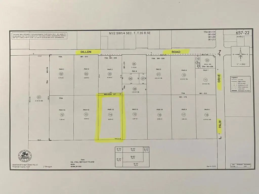 4.98 Acre lot for sale! County Use Code: Vacant Residential Land. This great property boasts a wonderful location, offering abundant opportunities for development or personal enjoyment. Very close to Dillon Rd and Palm Drive.** The lot is located right behind the property address on 66251 Dillon Rd.*Buyer is advised to verify all information through personal inspection.