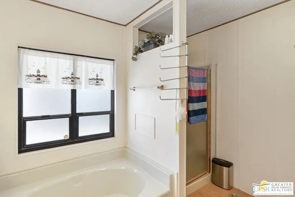 Welcome Home to this Triple wide home in the 55+ Desert View Mobile Home Club. As you enter this home, you will notice the vaulted beamed ceilings in the open living area with a Fireplace and built-in shelving. Just off the living area is a formal dining room with a built-in display cabinet and a window that showcases the view. The primary bedroom has an ensuite with a separate shower and tub and features a large walk-in closet. The generously sized guest room also has a walk-in closet. The Kitchen, with breakfast bar, has ample space for all your cooking needs and is open to the dining area. Off the kitchen is your Laundry room with extra storage and a seating area that can be used as a folding/sewing area or can be used to set up your home office. Enjoy the outdoors on your wrap-around covered patio with stunning views of the desert landscape and surrounding mountains, or gather fresh citrus fruit from several trees located on the property. Park amenities include a pool, mineral spas, a recreation room, and a picnic area. Make your appointment today to view this wonderful home with its stunning views.