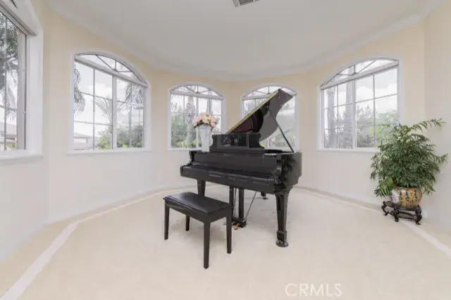 A dramatic two-story grand entry with a crystal chandelier welcomes you. Wide double staircases leading to different sections of the upper level set an impressive tone upon arrival.