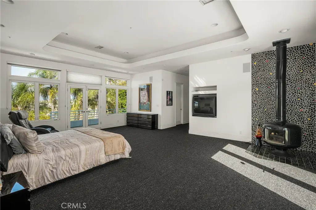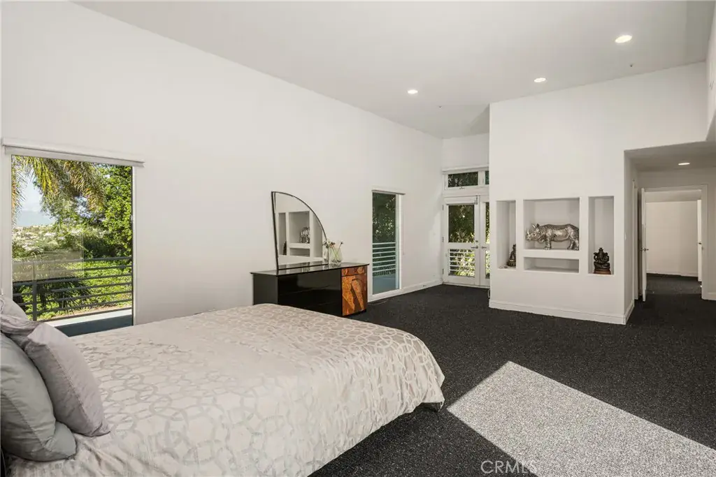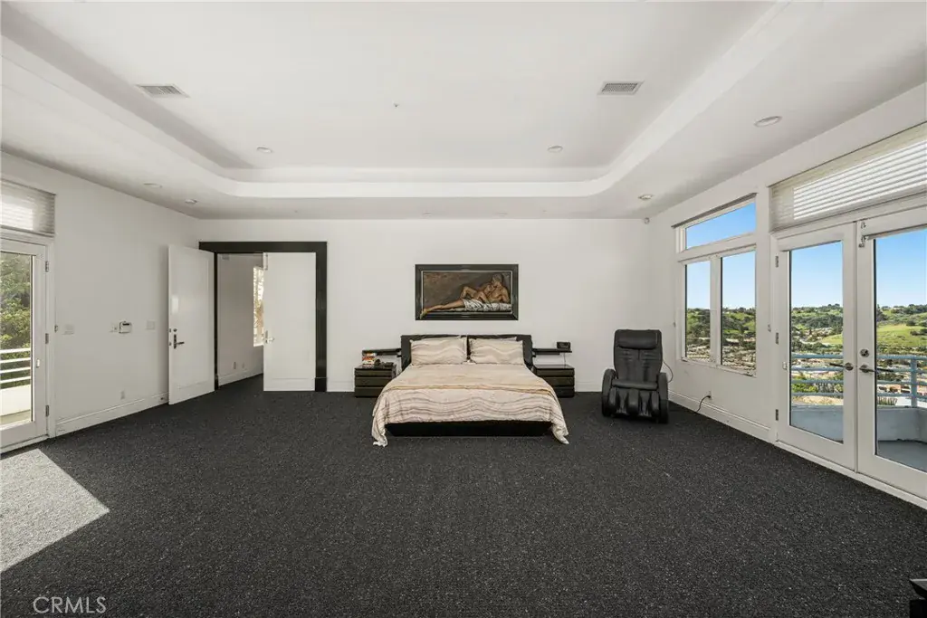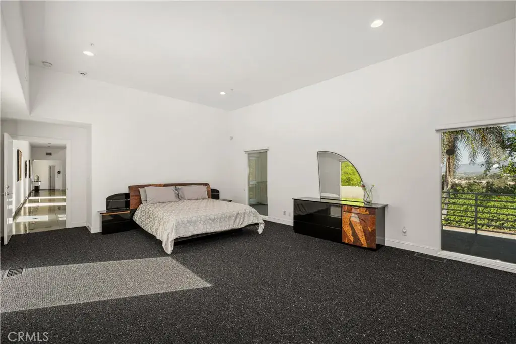 The home features eight spacious bedrooms, including two primary suites—one on each level. The upstairs primary suite is a true sanctuary with dual private balconies, two walk-in closets, dual spa-inspired bathrooms, and panoramic city and mountain views. Two additional junior suites upstairs provide comfort and privacy. On the main level, a second primary suite offers direct pool access, complemented by three additional bedrooms, including another junior suite.