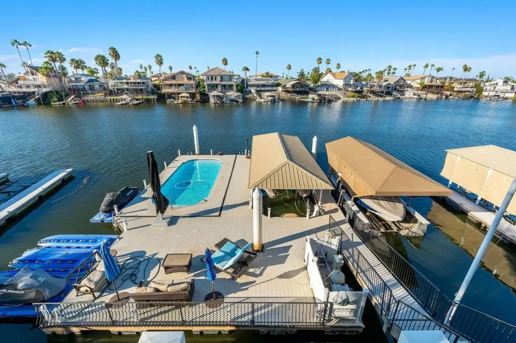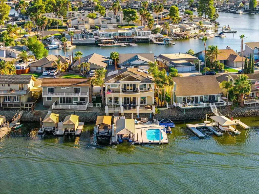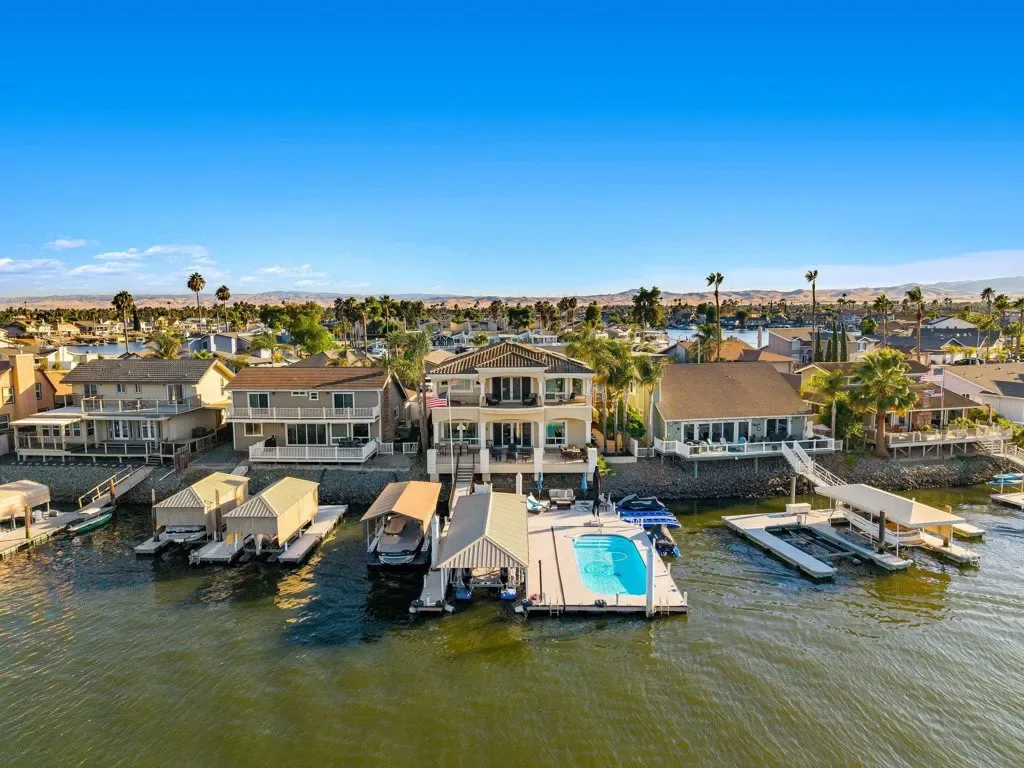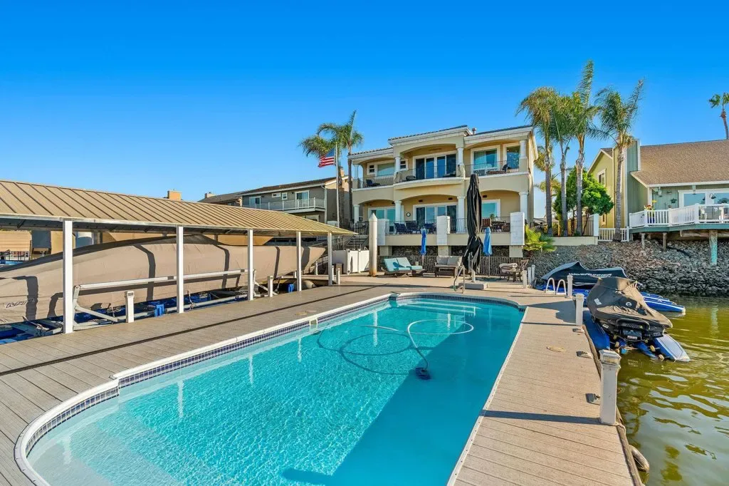 Nestled on a wide, serene bay, this spectacular Discovery Bay home offers unparalleled waterfront living! Gorgeous staircase and custom lighting give a captivating first impression! The spacious, airy great room provides formal dining, along with island seating for entertaining! Large windows maximize views whether you are enjoying the chef’s kitchen or seated around the fireplace. The meticulously crafted kitchen offers comfort, sophistication & ease! Walk-in pantry, deep sink, wide Viking stovetop- attention to detail is evident throughout. Custom bar overlooks the water and sliders lead to expansive deck & dock, melding the indoors with outdoor living. Covered deck has a kitchen + a seating area that overlooks double U dock with sparkling pool. One ensuite bedroom on main floor, or use the elevator to reach 4 more ensuite bedrooms. The primary suite is a true retreat, providing lavish amenities like delta views from the balcony, a seating or office area, fireplace, wet bar & wine fridge. Spa-like bath completes this luxury space w/deep, jetted tub + walk-in closet outfitted with beautiful built-ins. The three car garage boasts LOADS of storage w/ cabinets & extended space. Owned solar provides monthly savings, making this luxury estate smart, as well as beautiful! See it soon!