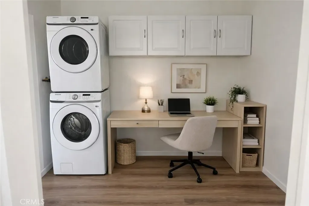The home features recessed lighting, elegant walnut cabinets, and sleek quartz countertops, along with a brand-new refrigerator. It also includes a brand-new washer and dryer, dual-pane windows, a sliding glass door, new faux blinds, and its own A/C and heating wall units for year-round comfort.