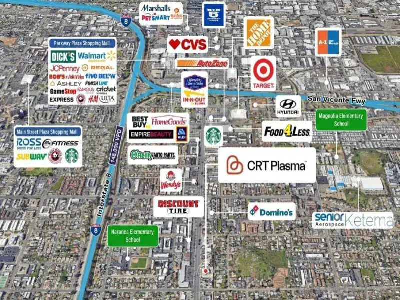Price improvement effective today! Regional Realty is pleased to exclusively market for sale a proposed single tenant sale leaseback (NNN) to CRT Plasma offering over a 7% cap rate. The proposed sale leaseback terms include a 15-year lease with 2.5% annual rental escalations throughout the primary term and four 5-year renewal options. The lease will be absolute triple net and feature no landlord responsibilities. The submarket boasts an extremely low vacancy rate of 3% according to CoStar. The practice is led by a Johns Hopkins-trained transfusion medicine specialist and has experienced strong success. Please inquire with broker for financial information. The 15,632-square-foot building is strategically located along Broadway, a primary thoroughfare with traffic exceeding 24,700 vehicles per day. Broadway hosts a wide range of major retailers, including Target, Food 4 Less, The Home Depot, Best Buy, ALDI, and Home Goods, as well as Parkway Plaza, a regional shopping center featuring Dick’s Sporting Goods, JC Penney, H&M, Regal Cinemas, Ashley, Bath & Body Works, and more. The property also offers close proximity to Interstate 8 (148,000 VPD) and CA-67 (100,000 VPD), enhancing accessibility. Situated in a densely populated area, the asset serves over 308,000 residents within a five-mile radius, with an average household income of $124,210.