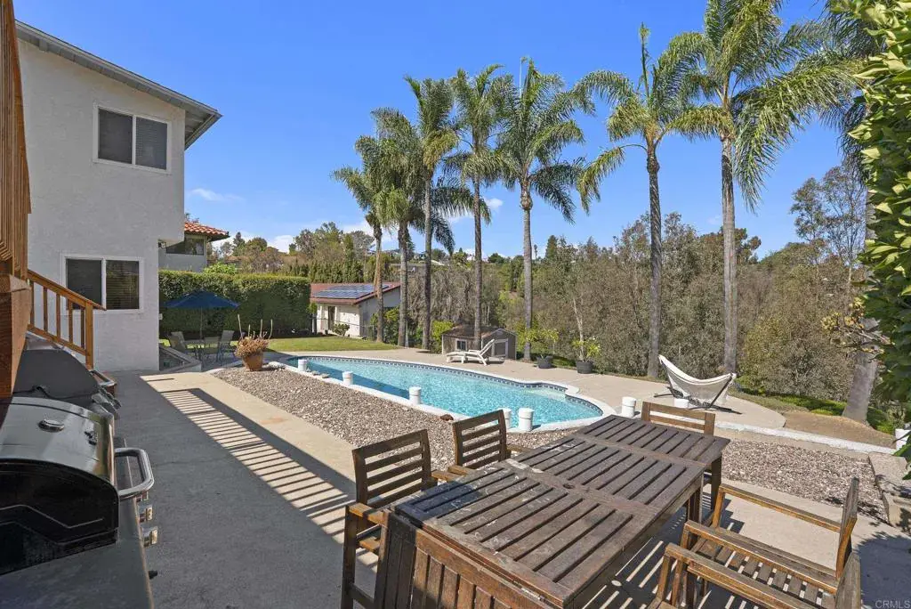 Discover your own private paradise in Fletcher Hills—where panoramic views, a sparkling pool, and expansive outdoor living areas create the perfect retreat. Spacious 4-bedroom, 2-bath split-level home offers 1,920 SF of living space on a rare 16,000 SF usable lot. Home is tucked away on a quiet cul-de-sac for ultimate privacy. Step inside to find a warm and inviting living room with a cozy wood-burning fireplace, skylights, vaulted ceilings, and double-pane windows that bring in natural light. The family room showcases mid-century wood beam ceilings, adding to the home’s character. The upgraded kitchen is a chef’s dream with a 5-burner gas range, double ovens, wine fridge, newer cabinetry, a large pantry, gorgeous counters, and an eat-at island. The backyard is an entertainer’s paradise. Enjoy the sparkling pool, a brand-new deck with sweeping views, multiple outdoor sitting areas, a fire pit, and a shed for extra storage. Low-maintenance landscaping in the front yard makes upkeep easy. Additional highlights include owned solar, central AC and forced air heat, and plenty of space to relax or host. Possible ADU! This home truly blends style, function, and lifestyle in desirable Fletcher Hills location.
